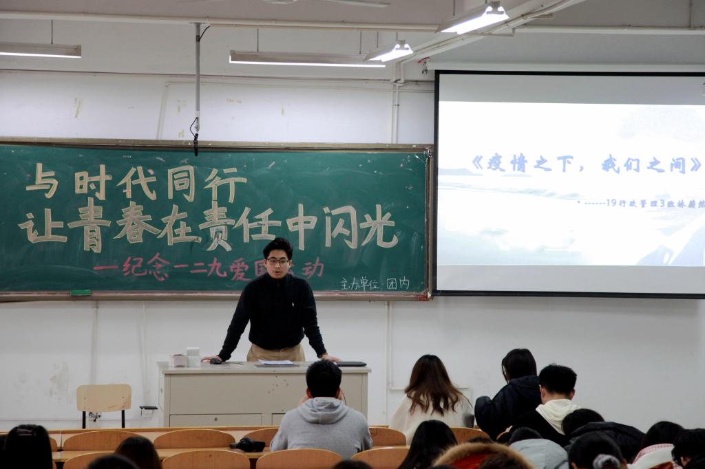风云倏变,百年将过。为更好地弘扬一二·九爱国精神,增强青年人的时代担当。12月9日下午1:30分,人文学院于图教楼B205举办了“与时代同行,让青春在责任中闪光”主题分享会。辅导员高欢欢、梅冬琴、学生干部代表与各班级学生代表参加了本次分享会,祁心悦担任主持。