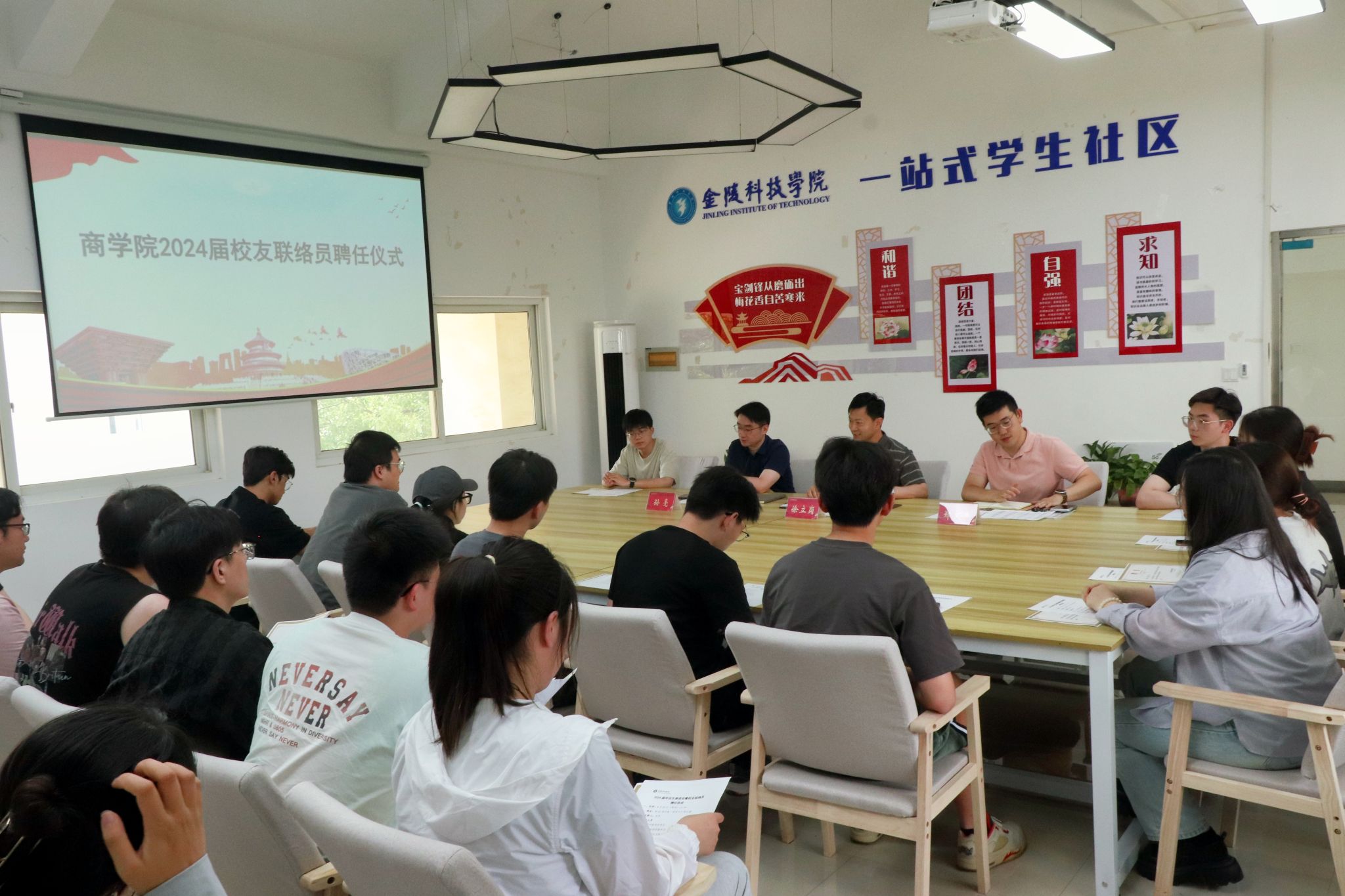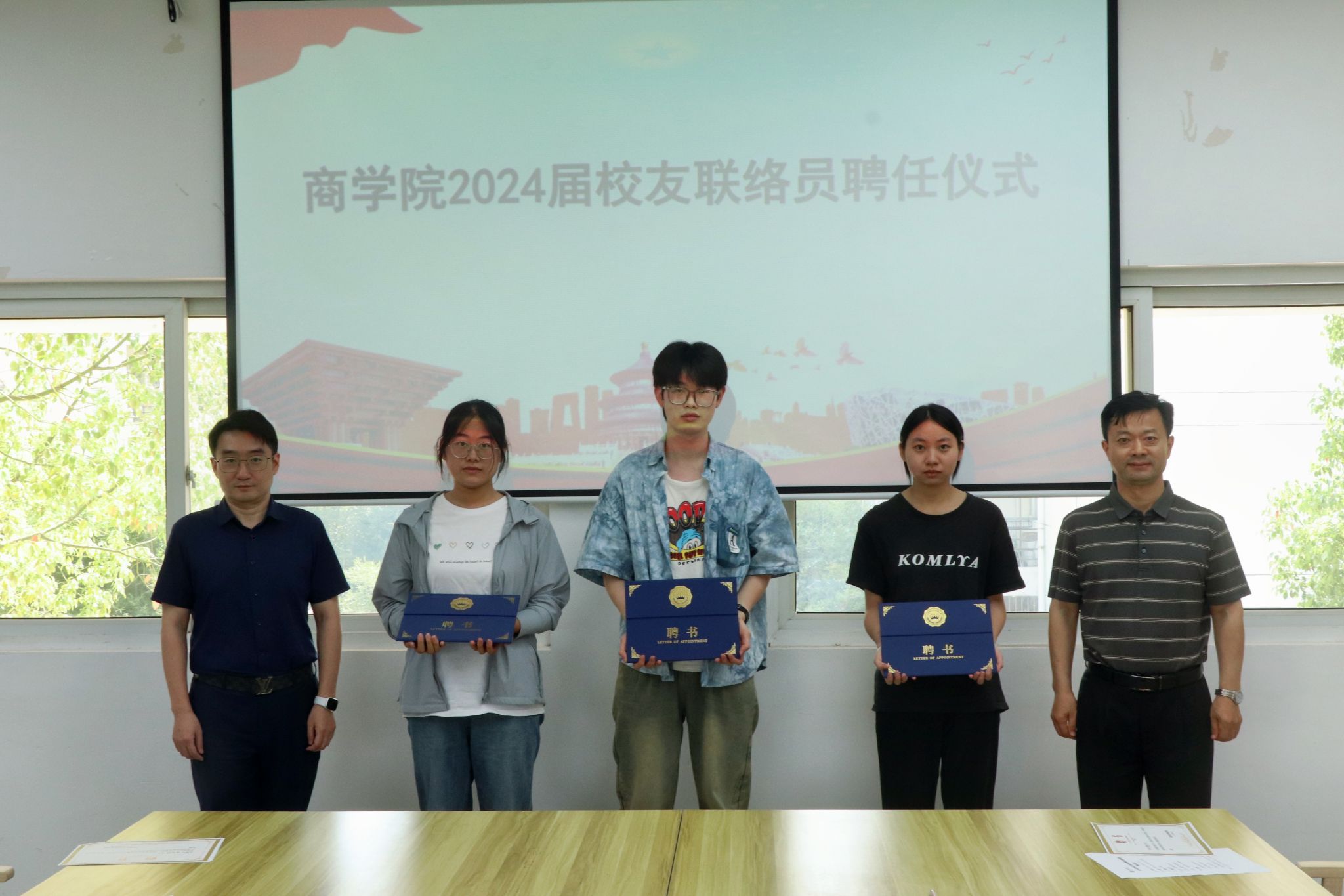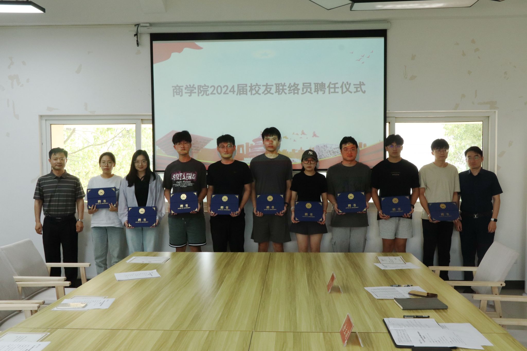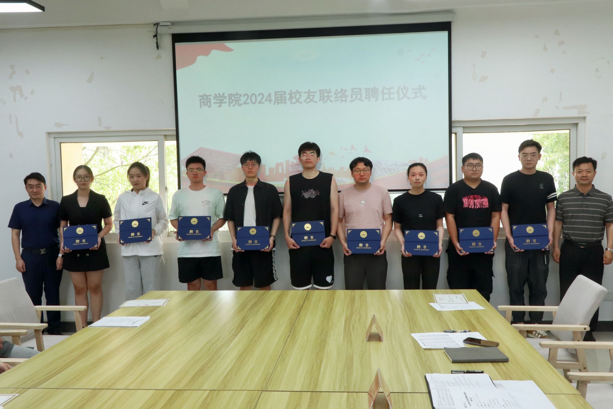聘任仪式的最后,徐立岗和孙亮依次为校友联络员颁发聘书并合影留念。他们为毕业生代表送上了最真挚的祝愿,希望他们都能前程似锦、顺心如意,也欢迎大家能常回校看看,为学校的发展添砖加瓦。