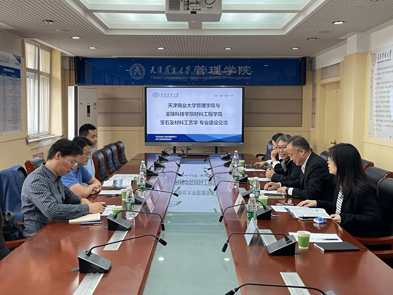 在天津商业大学,双方就专业建设、课程设置、科研创新以及人才培养模式进行了详细讨论。天津商业大学分享了近年来在宝石及材料工艺学领域的实践经验和学科发展成果,并就如何通过校企合作和交叉学科创新提升教学质量提出了宝贵建议。天津商业大学管理学院书记庞文生、院长王庆、珠宝系系主任马云璐、支部书记郭晶、李国忠老师等参加交流。