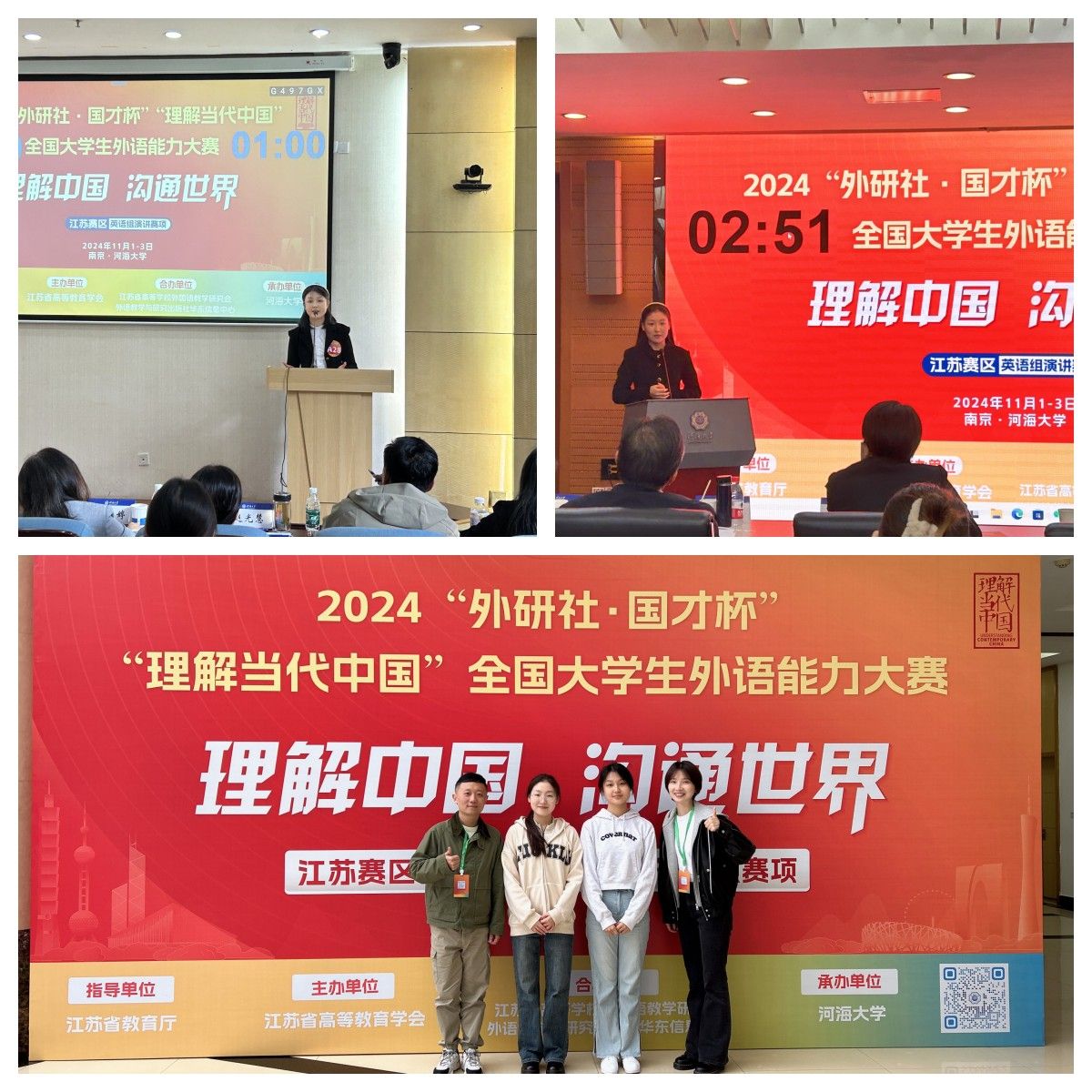 11月1日至3日,2024“外研社•国才杯”“理解当代中国”全国大学生外语能力大赛英语组演讲省赛在河海大学举行。kaiyun官网外国语学院22英语(2)班滕菲同学在本次比赛中荣获二等奖,商学院22市场营销(2)班夏晓彬同学荣获三等奖,创kaiyun官网参加该项赛事以来的最佳成绩。
