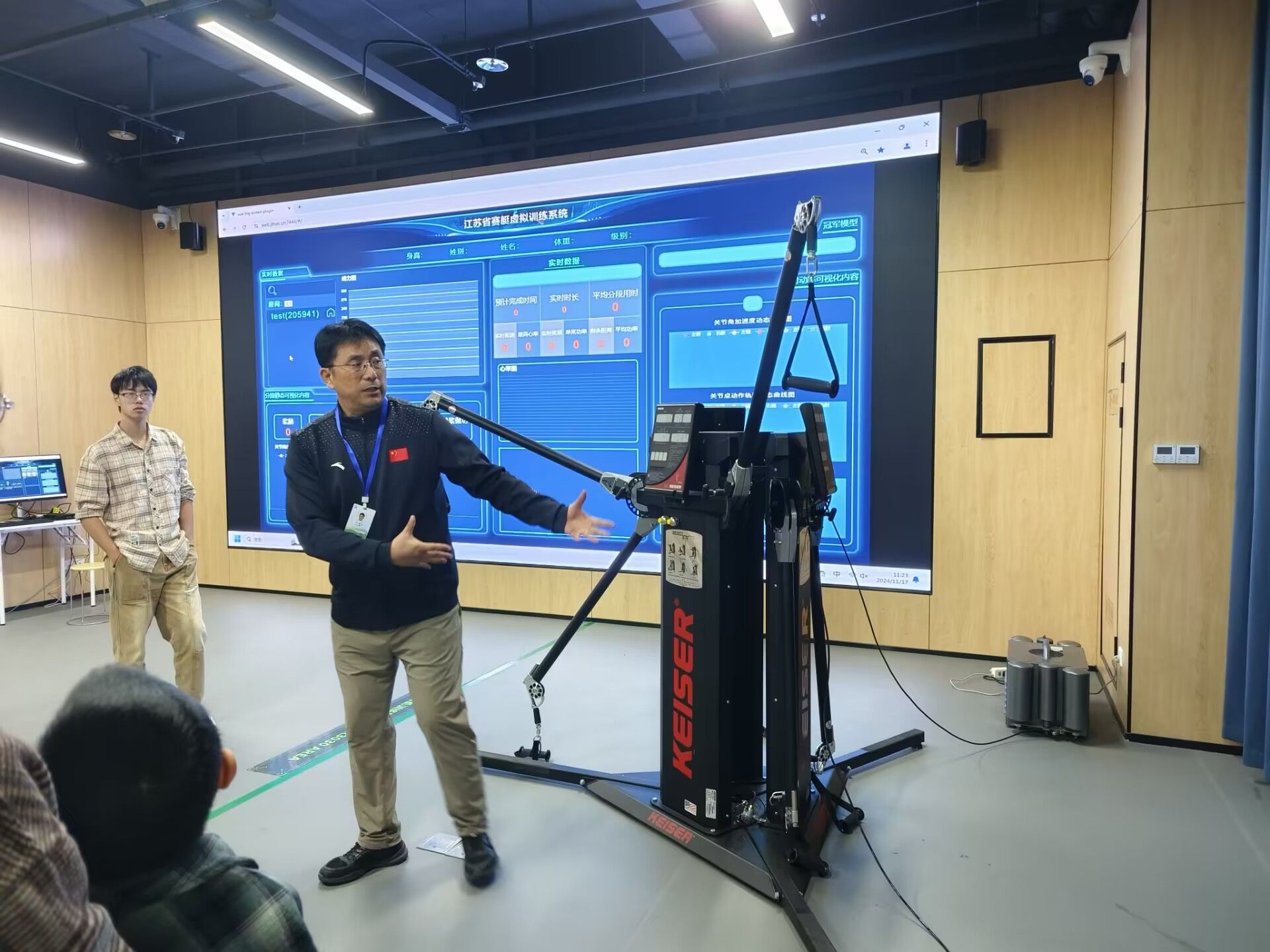 教学活动中,赵海峰讲授《AI赋能竞技体育》,以赛艇陆上训练数智分析为例,引导学生进一步了解数字体育的概念、特征、应用场景和未来发展趋势。
