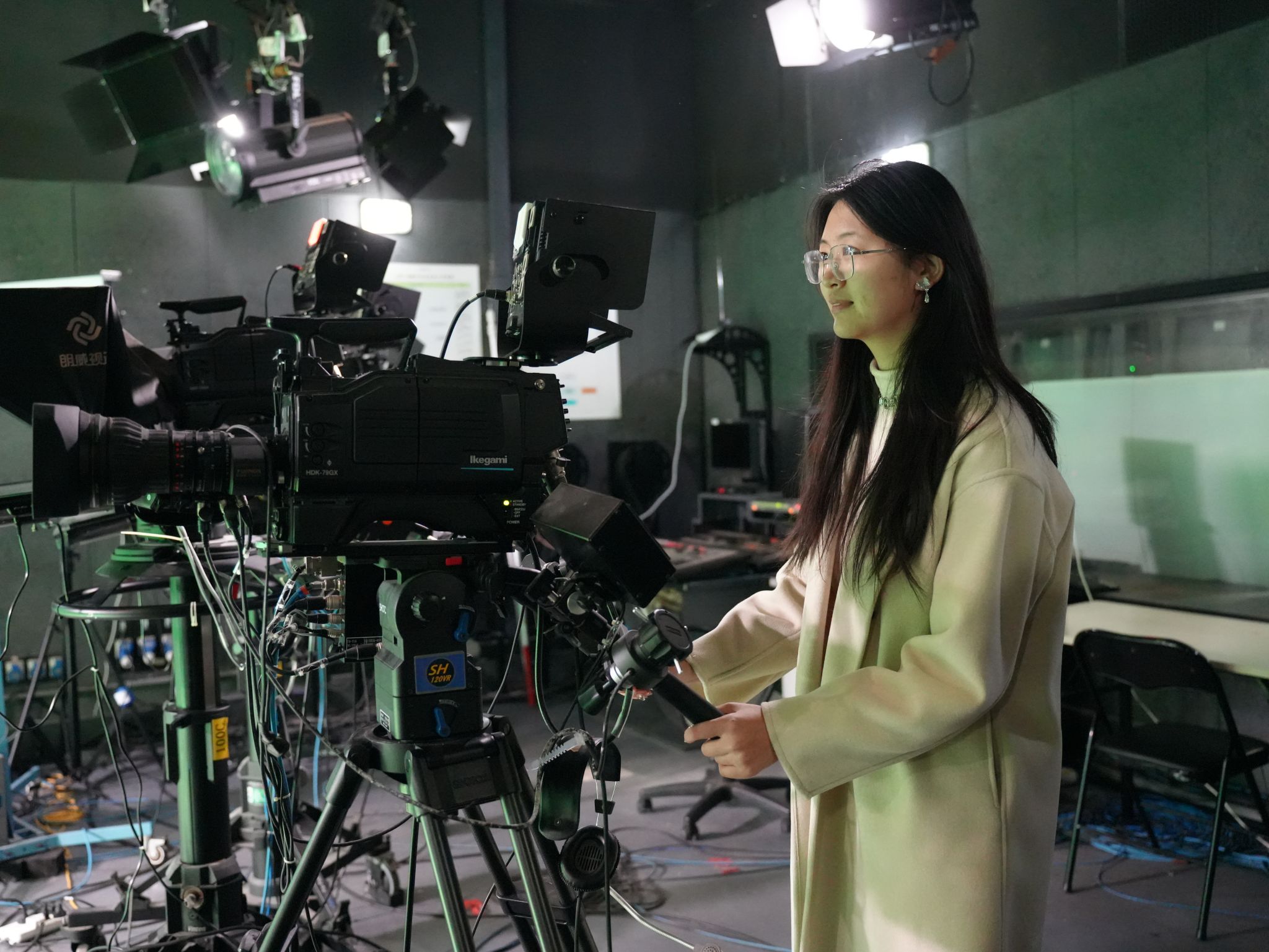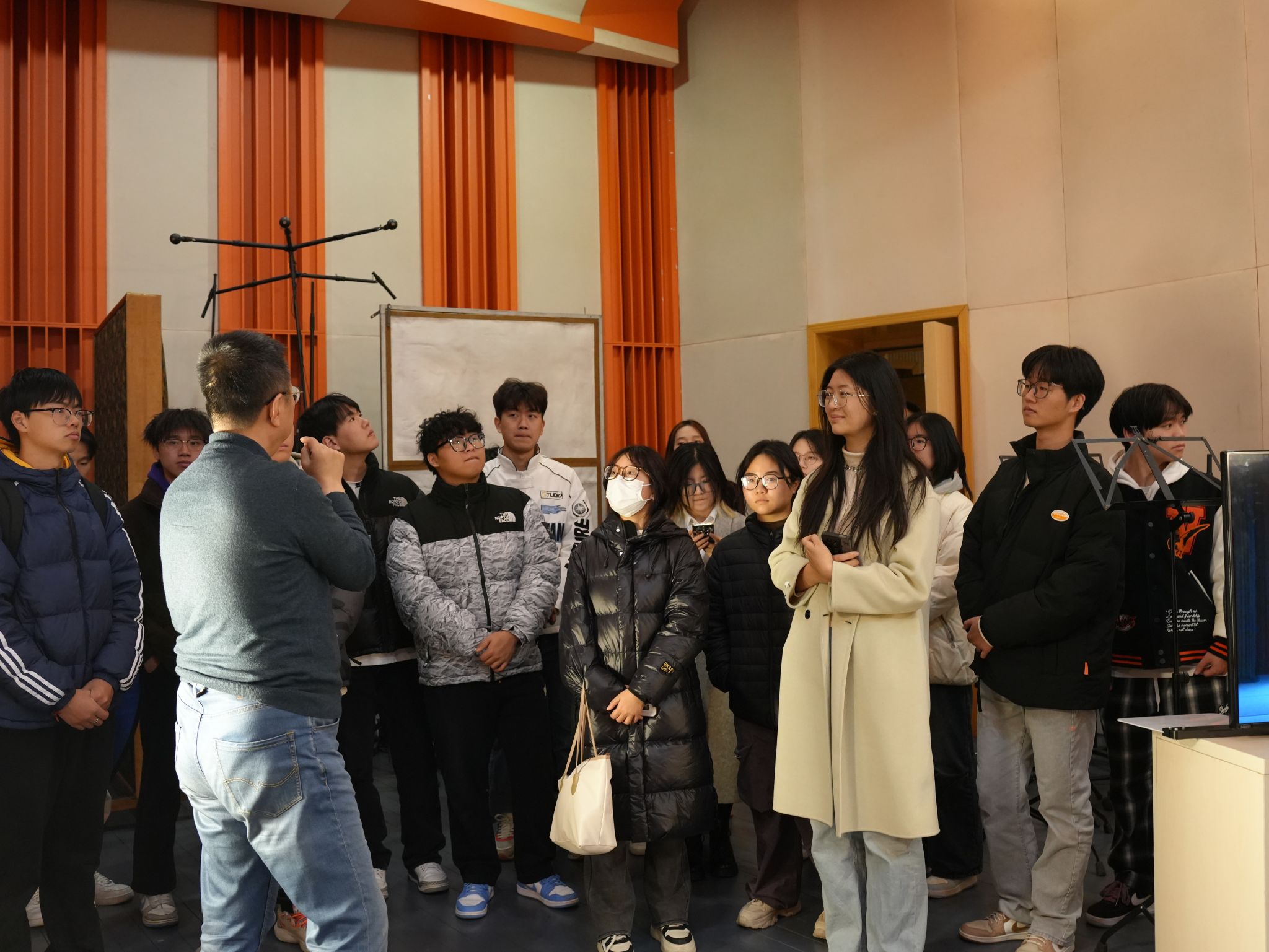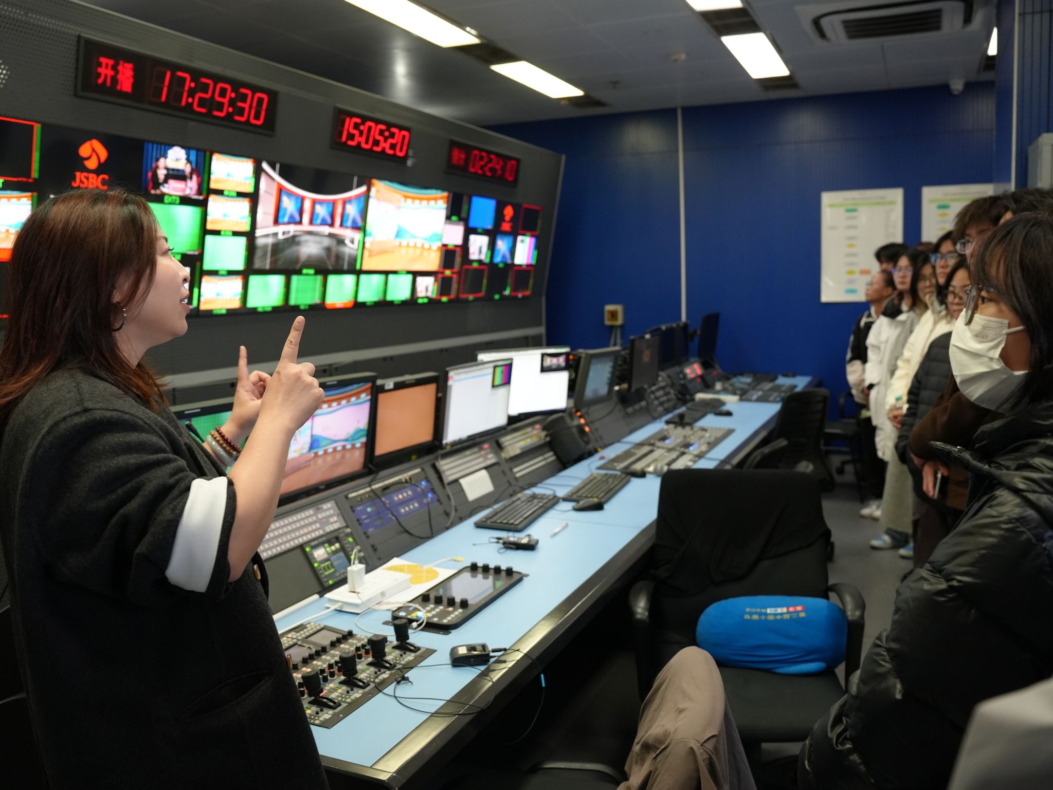 在教学活动中,周时带领微专业师生进入总台,对活动演播厅、虚拟背景演播室、总台导播室、IPTV集成播控机房、录音录播室等场所进行了观摩体验。周时以总台的数字媒体应用场景为载体,通过讲解、启发、操作体验等教学手段,引导学生深度体验和感悟数字技术在传统媒体中创新应用路径与核心价值,激发学生对数字媒体技术交叉应用与云赛事服务的学习与实践兴趣。
