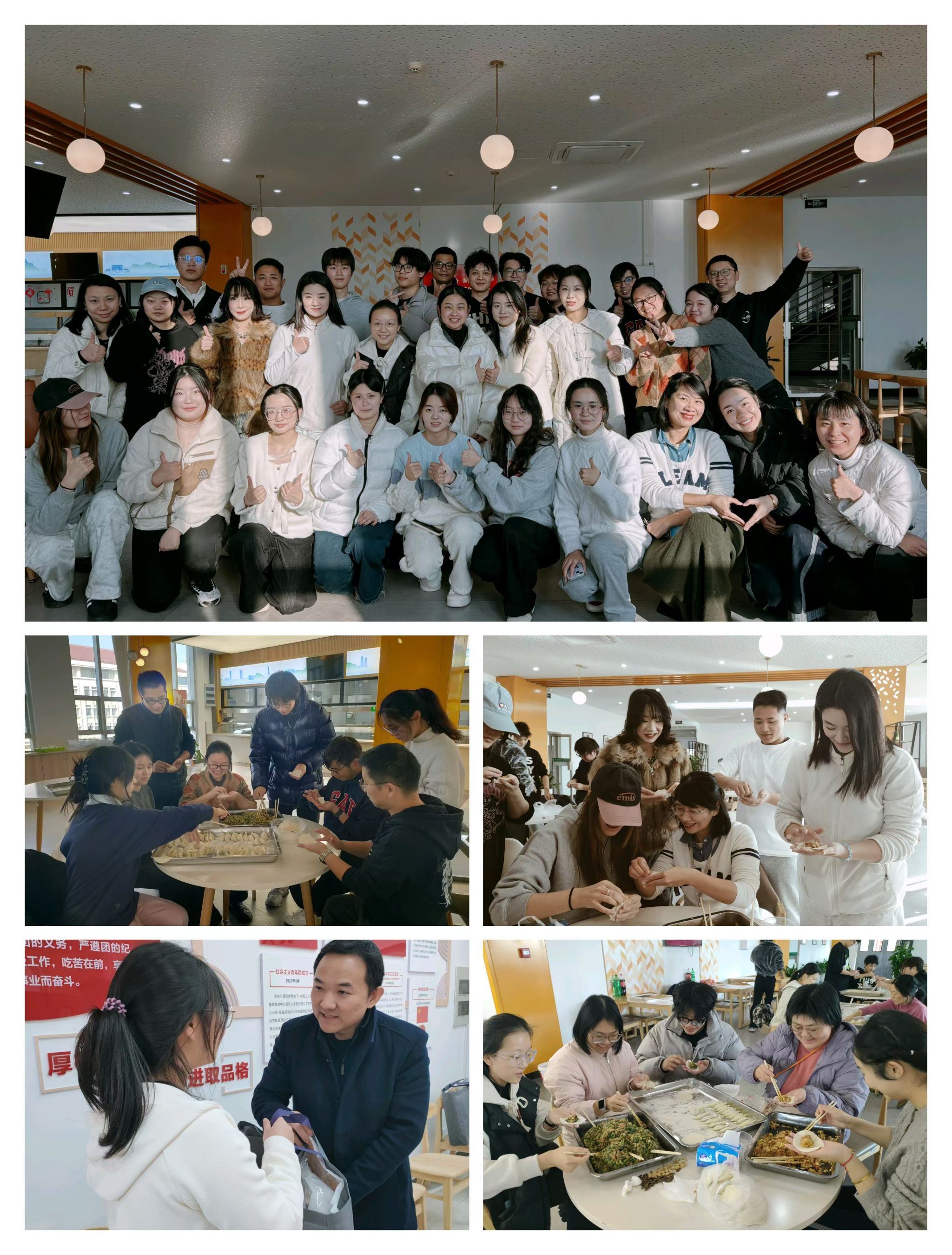 活动伊始,大家围坐一堂,手执饺子皮,包裹着各式各样的馅料,每一个饺子都承载着独特的情感与创意。对于初次尝试包饺子的同学而言,这不仅是一次动手实践的机会,更是一堂生动的传统文化教育课。在欢声笑语中,饺子渐渐铺满了桌面,空气中弥漫着节日的喜悦与家的味道。活动期间,学院领导与教师深入学生,就大家关心的话题开展交流。匡才远一一了解了毕业班同学们的就业情况,鼓励大家增强信心,充分利用好学校、学校提供的平台渠道,实现高质量就业。同时学院将一如既往地提供全方位的就创业指导与服务,助力每位同学找到适合自己的职业道路。鲍锐关心同学们的生活情况,叮嘱大家天冷加衣,加强安全意识,并和辅导员们将暖冬“大礼包”发放到部分学生手中,让学生切实感受到学校的关怀与温暖,体会到来自大家庭的支持与鼓励。黄向群仔细询问了大一、大二、大三同学们的学业进展与未来规划,引导同学们既要深耕专业领域,又要拓宽视野,培养创新思维,积极参与社会实践,为职业生涯的多元化发展做好准备。辅导员、班主任和专业老师们走近同学身边,就大家关心的专业学习、就业指导、生涯规划、资助政策、心理健康、反诈安全等方面做了耐心细致的解答,给出了精心诚恳的建议。师生们边包饺子边分享了各自家乡冬至的传统习俗,从饮食文化到节日仪式,每一份分享都加深了对中华民族传统文化的理解与认同。随着一盘盘热气腾腾的饺子出锅,大家围坐一堂,共享美食,共话未来,现场洋溢着浓浓的温情与希望。