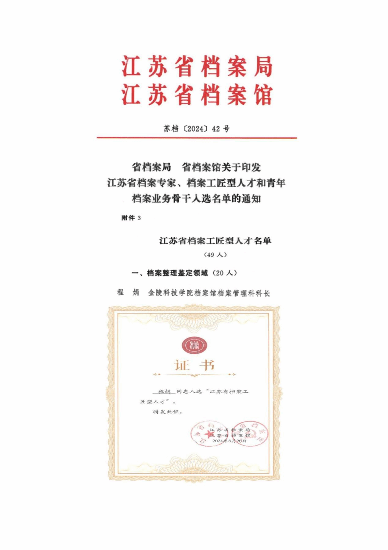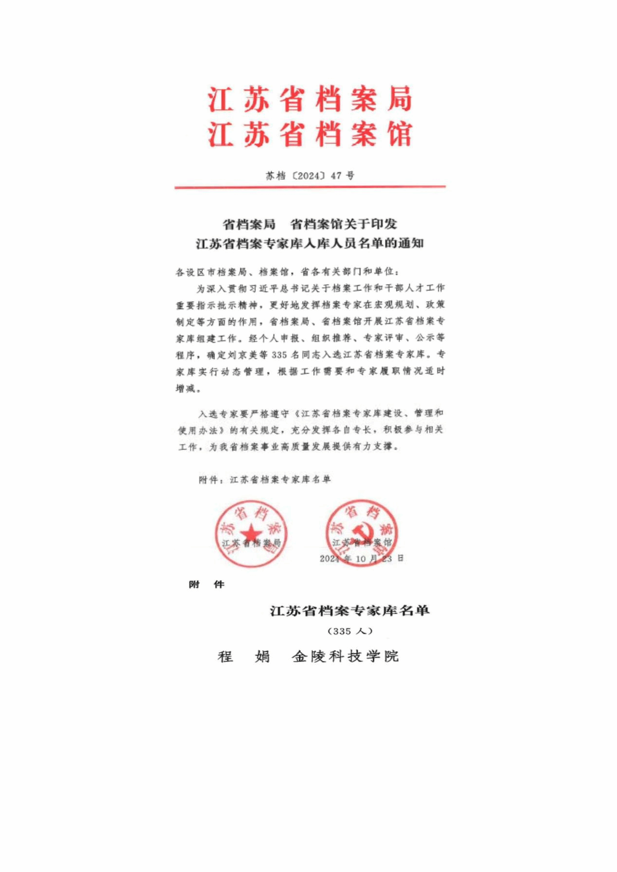 另据江苏省档案局、江苏省档案馆发布的《关于印发江苏省档案专家库入库人员名单的通知》(苏档[2024]47号),程娟老师也成功入选江苏省档案专家库。此次江苏省档案专家库的组建,经过个人申报、组织推荐、专家评审和公示等程序,全省高校档案馆人员入选江苏省档案专家库成员共计63人。