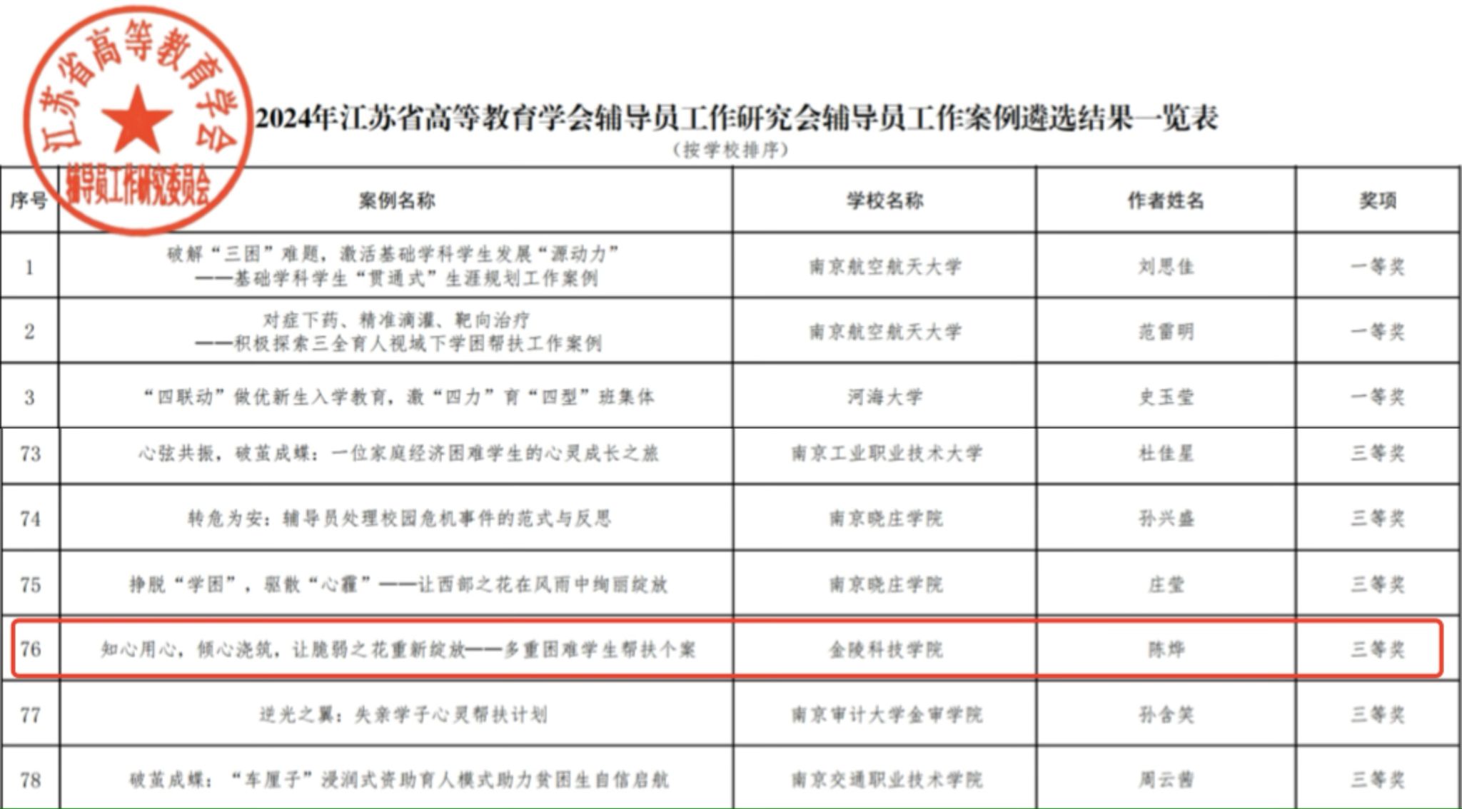 根据江苏省高等教育学会辅导员工作研究会发布的《2024年江苏省高等教育学会辅导员工作研究委员会辅导员工作案例评审结果》,kaiyun官网艺术学院辅导员陈烨申报的《知心用心,倾心浇筑,让脆弱之花重新绽放——多重困难学生帮扶个案》荣获2024年江苏省辅导员工作案例三等奖。