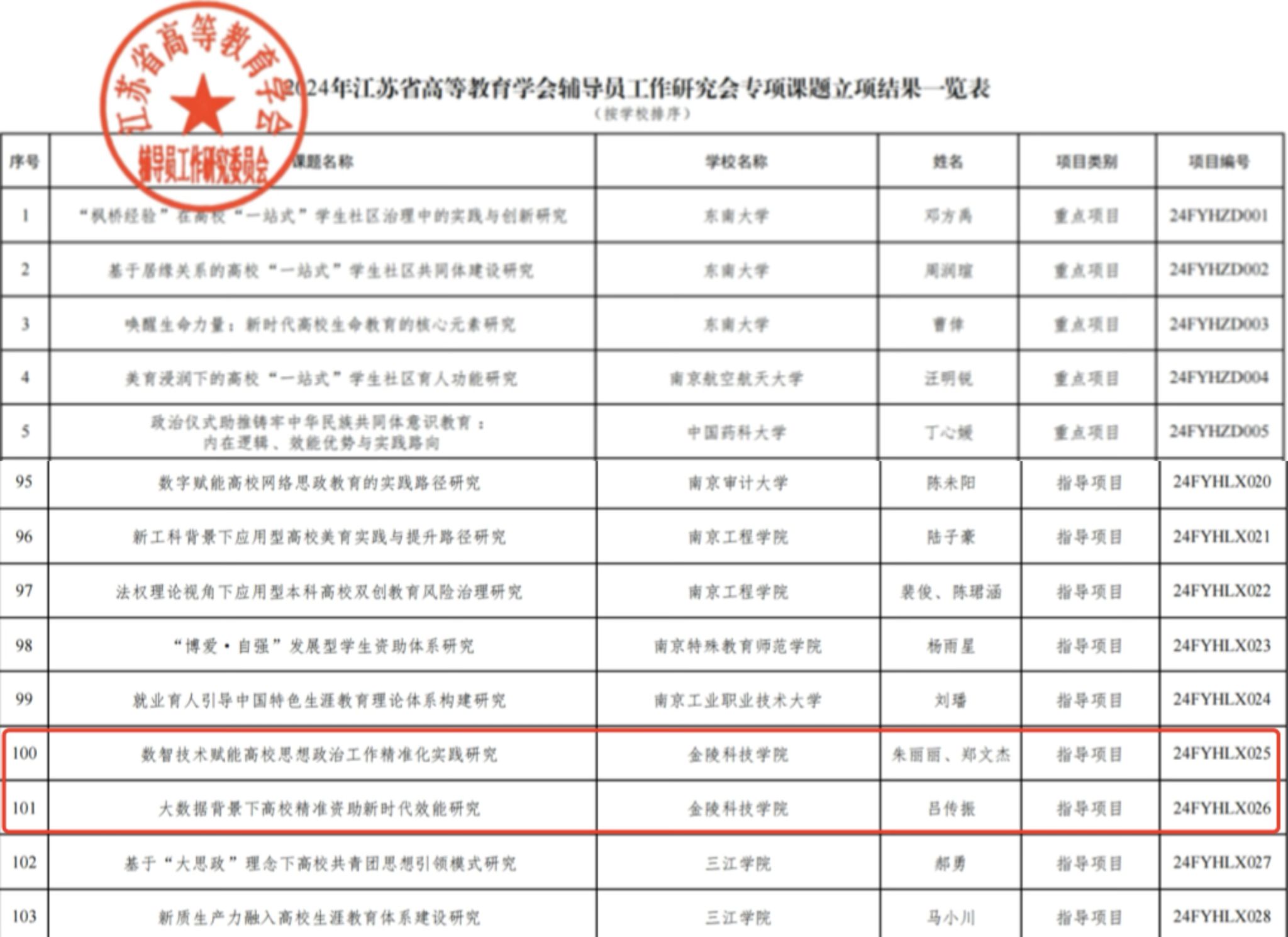 此外,kaiyun官网软件工程学院辅导员朱丽丽、商学院辅导员郑文杰申报的《数智技术赋能高校思想政治工作精准化实践研究》和网络与通信工程学院辅导员吕传振申报的《大数据背景下高校精准资助新时代效能研究》立项2024年江苏省高等教育学会辅导员工作研究会专项课题指导项目。