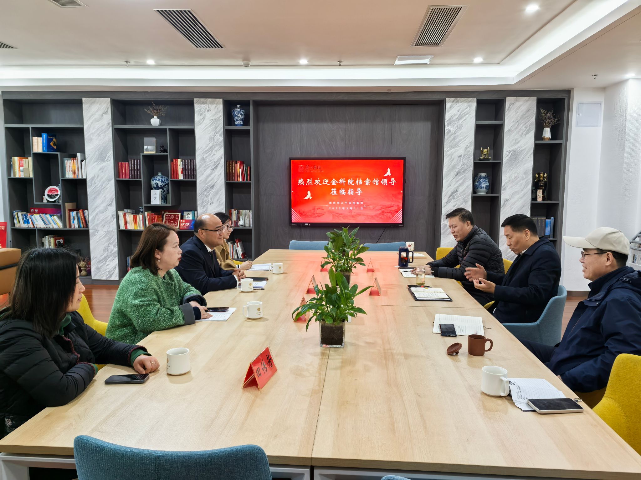 江宁区档案馆副馆长贺金鹏及同仁热情接待我馆一行,并详细介绍了该馆在档案资源建设、信息化建设、档案开发利用等方面的经验做法。座谈会上,双方以“互鉴共进、协同创新”为主题,就档案管理提质、档案数字化转型升级、爱国主义教育基地共建、科研合作、特色档案开发等议题展开深入探讨,并就未来合作方向达成共识。