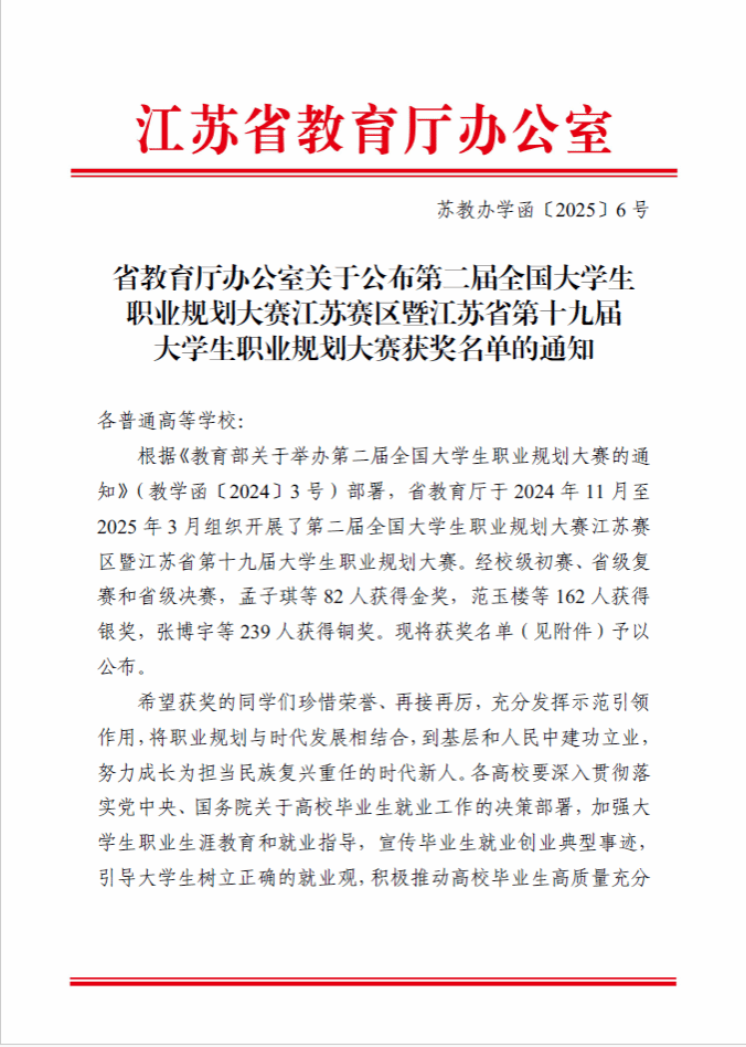 近期,在江苏省教育厅组织开展的第二届全国大学生职业规划大赛(江苏赛区)暨江苏省第十九届大学生职业规划大赛中,kaiyun官网软件工程学院的余舒沁、建筑工程学院的涂立群同学分别获得就业赛道高教本科生组、成长赛道高教组铜奖。