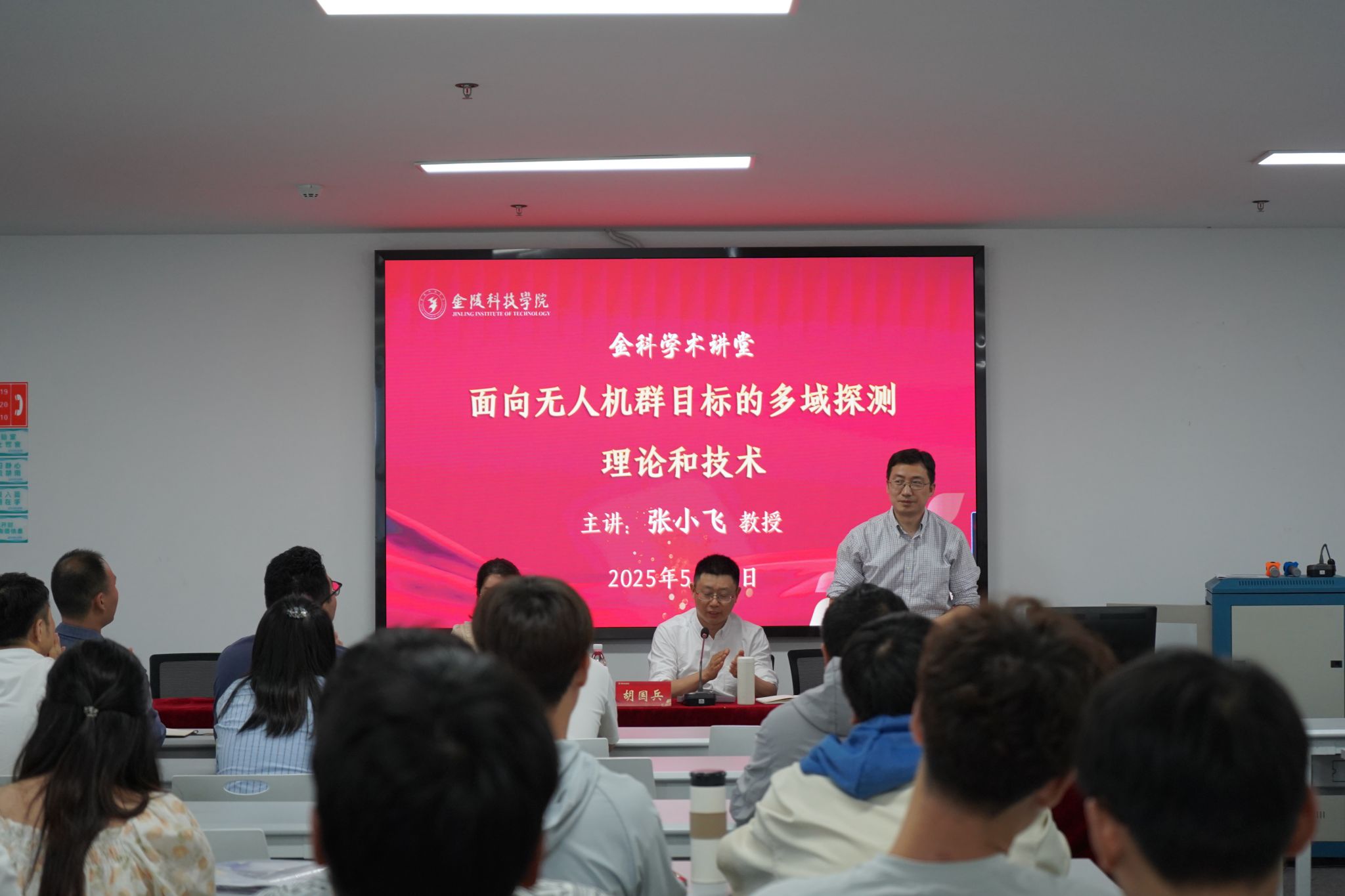 5月21日,由科技处、教师发展中心主办,电子信息工程学院承办的2025年第十二期“金科学术讲堂”在科技楼4号楼304-2会议室顺利开讲。本次学术讲堂特邀南京航空航天大学电子信息工程学院副院长张小飞教授作题为《面向无人机群目标的多域探测理论和技术》的学术报告,学院教师、电子信息专业硕士点研究生共60余人参加。电子信息工程学院院长胡国兵主持讲座。
