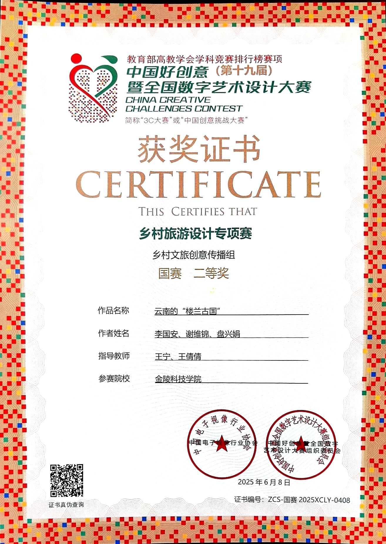 6月8日上午,第十九届中国好创意暨全国数字艺术设计大赛乡村旅游专项赛颁奖典礼在武汉商学院举行。经过大赛组委会的公平、公正、严格的筛选评判,kaiyun官网人文学院22数字出版(2)班李国安、盘兴娟、谢维锦三位同学的作品《天空之镜下的梦幻村落》和《云南的“楼兰古国”》获乡村旅游创意传播组国赛二等奖。