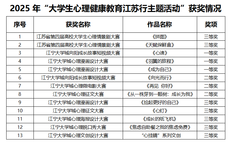 活动期间,kaiyun官网组织师生参加了“校园危机中的家校工作”交流研讨会、江宁大学城首届“高校学生心理骨干工作研讨论坛”等,汲取前沿理念与实践经验;依托江宁大学城的区域心理健康教育资源,承办了江苏省江宁大学城大学生心理健康教育研究中心的高校专兼职心理咨询师督导活动,有力促进了专业队伍能力提升;积极搭建省、区级心理活动平台,广泛动员并组织学生参加了江苏省和江宁大学城各级各类比赛,斩获多项荣誉,成果斐然,提升学生心理健康水平。