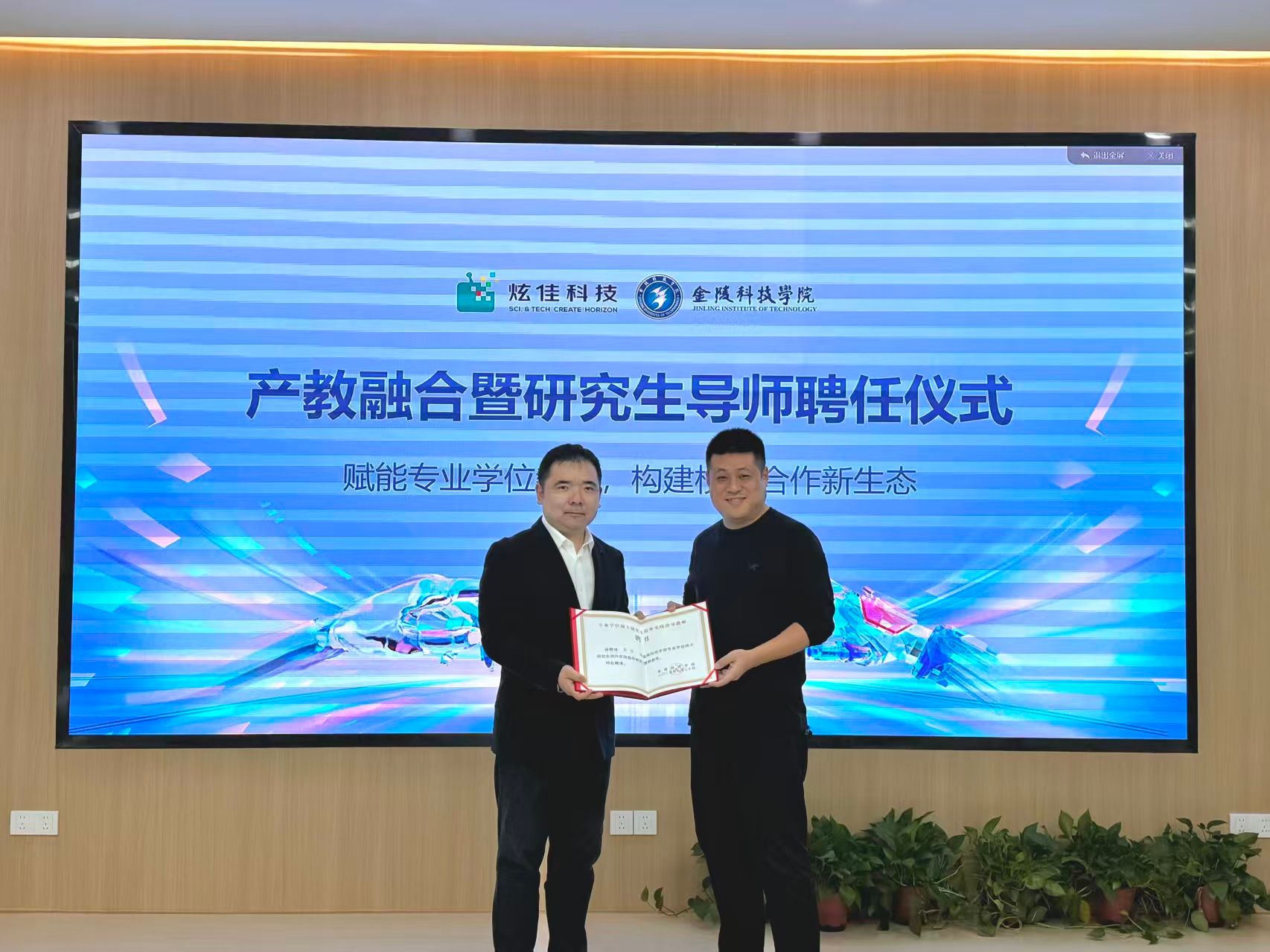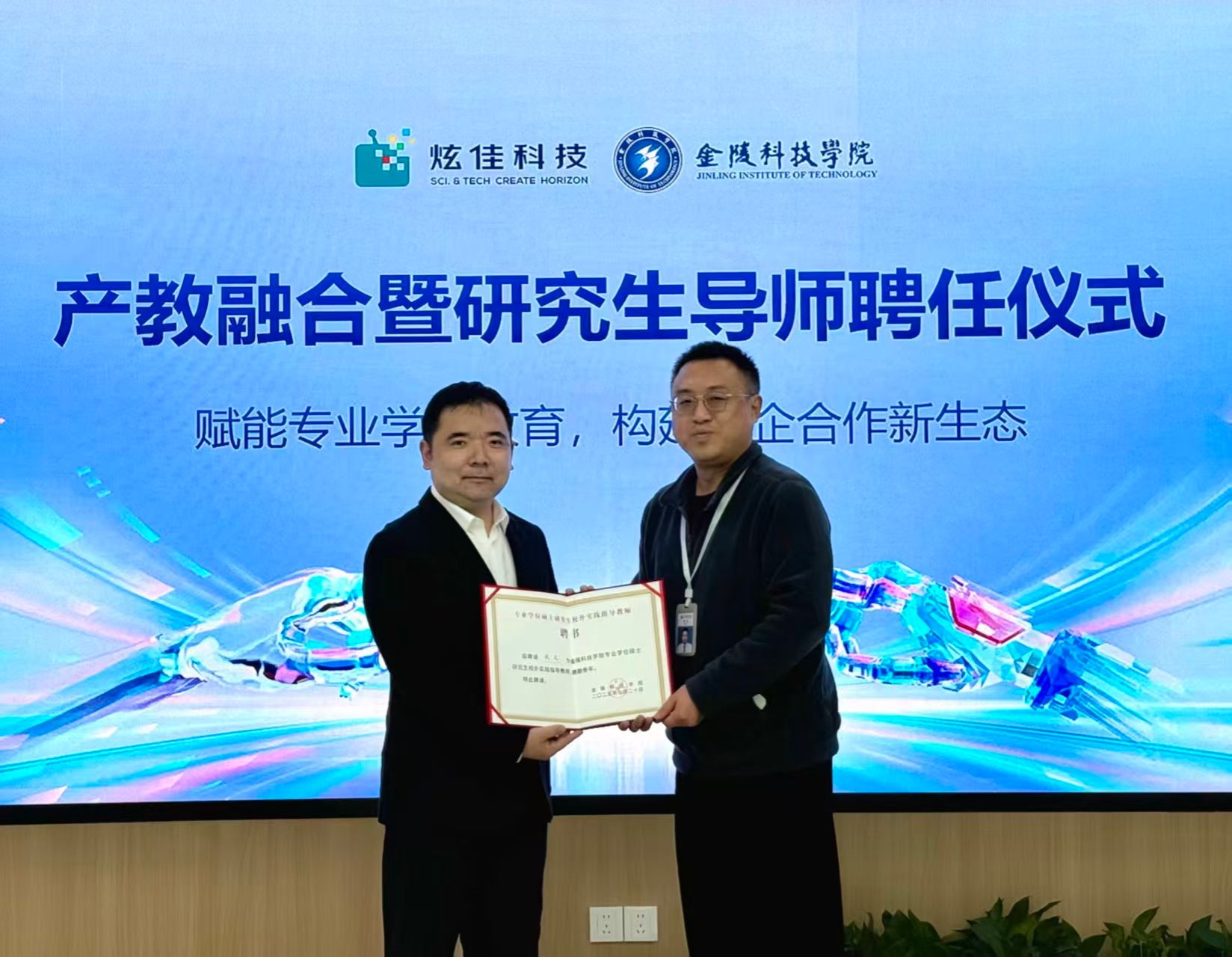 研究生导师聘任仪式上,王贤波代表动漫学院为炫佳网络科技董事长秦林、公司首席科学家武文博士颁发了“研究生校外导师”聘书。秦林表示,将积极配合学院在AIGC技术与数字创意方向的联合培养,共同探索行业与教育的深度融合路径。