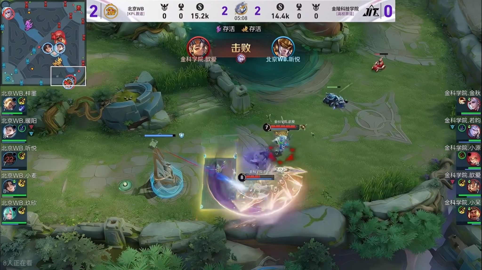 JIT战队的首场比赛于12月9日18:00进行,对手是本次赛事的3号种子——来自KPL赛道的北京WB战队。面对双方实力存在客观差距,JIT战队在赛场上毫无惧色,敢打敢拼。一波波精彩的团战配合、一次次果断的出击击败,不断点燃现场气氛,赢得观众阵阵喝彩。
