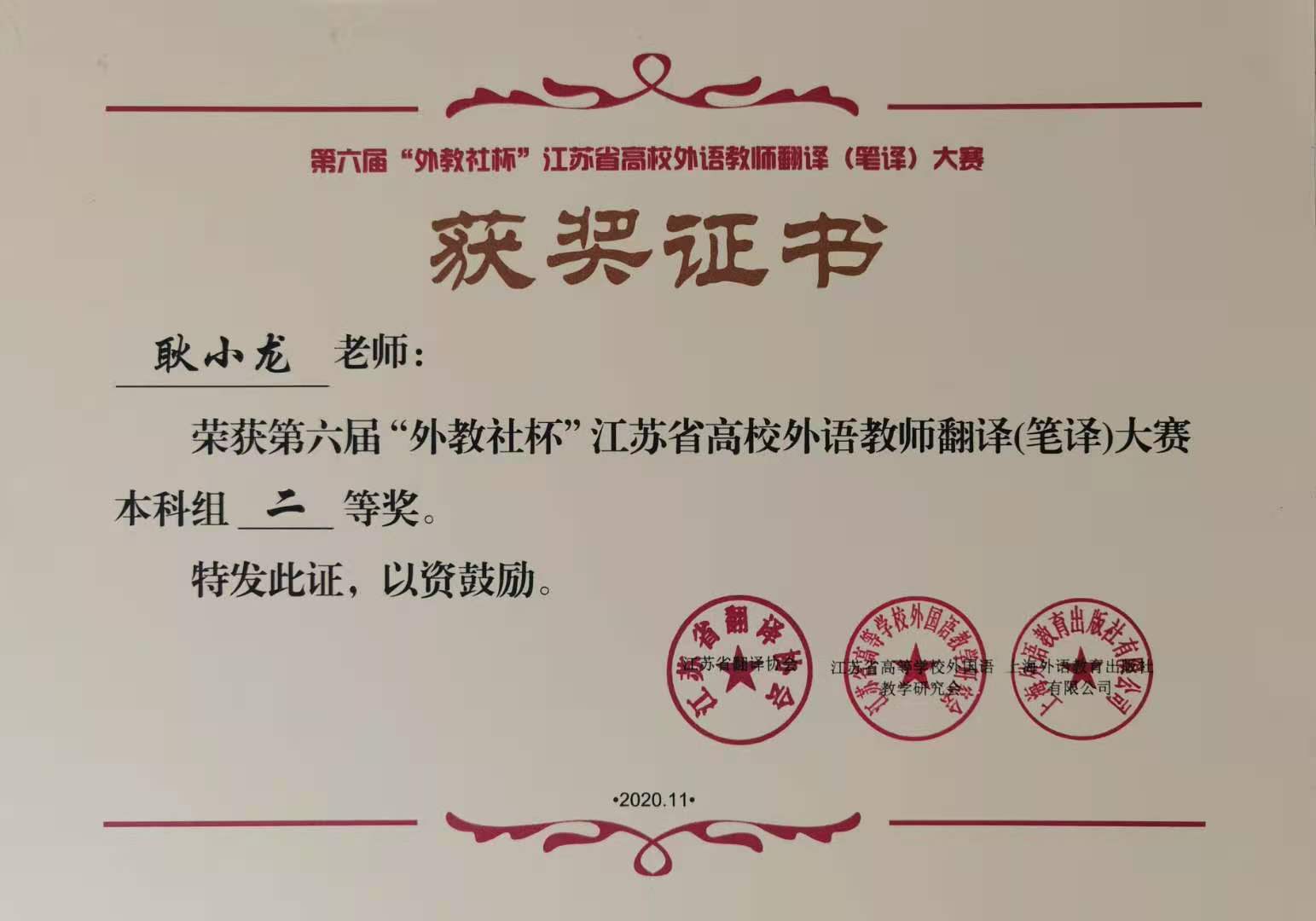 11月20日-21日,第六届“外教社杯”江苏省高校外语教师翻译(笔译)大赛暨颁奖典礼在常州工学院落下帷幕。本次大赛由江苏省高等教育学会指导,江苏省翻译协会、江苏省高等学校外国语教学研究会以及上海外语教育出版社共同主办,常州工学院外国语学院承办,分为本科组与高职组两个组别,来自全省六十余所本科和高职院校近百名教师参加了本次大赛,kaiyun官网外国语学院耿小龙老师在本次大赛中荣获本科组二等奖。