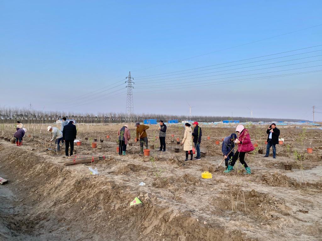 园艺系马艳教授、青年教师张敏博士、18级设施班王耀龙同学携种苗前往东台市,为当地工人详细讲解了种苗的特性和种植要点,分发栽植所需肥料,并拿起铁锹加入到栽植行列中,扶苗、铲土、填坑、踩实、浇水······在大家的共同努力下,425株种苗满载着期待和希望,植根于盐碱土中,为当地增添了一抹新绿。