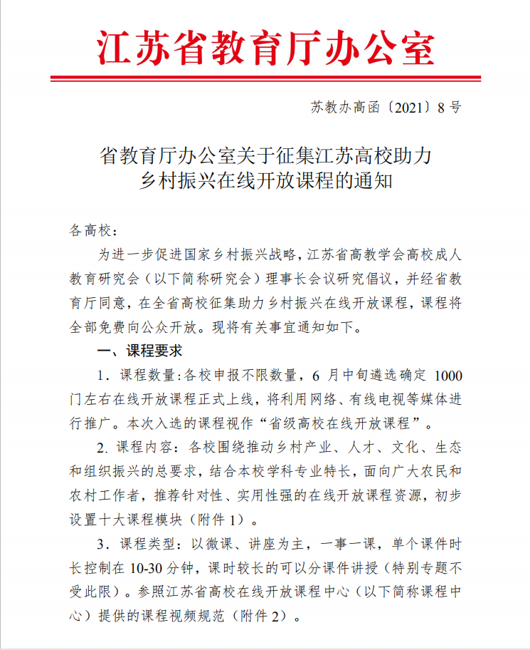 为进一步促进国家乡村振兴战略,响应江苏省教育厅《关于征集江苏高校助力乡村振兴在线开放课程的通知》(苏教办高函〔2021〕8号)文件要求,继续教育学院积极发挥农科教平台优势,围绕推动乡村产业、人才、文化、生态和组织振兴的总要求,组织相关专家,录制在线开放课程,充实高校课程资源。本次征集课程具体涉及乡村党建、三农政策、科学种地、养殖天地、农产加工、农产贸易、智慧农业、乡村教育、健康生活及美丽乡村共十个模块。
