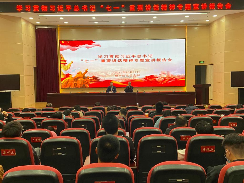 10月27日下午,理学院举办学习贯彻习近平总书记“七一”重要讲话精神专题宣讲报告会暨中心组集中专题学习会。市委宣讲团成员、马克思主义学院秦广东副教授作专题宣讲报告,理学院教工及2021级新生共计100余人聆听了报告。报告由学院书记雍海龙主持。