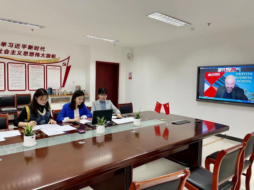 11月5日上午,国际合作与交流处与格里菲斯大学举行线上视频会议,国际合作与交流处处长李响教授、格里菲斯大学商学院国际部主任Peter Woods副教授、大中华区市场部主任Sherman Xia等参会。