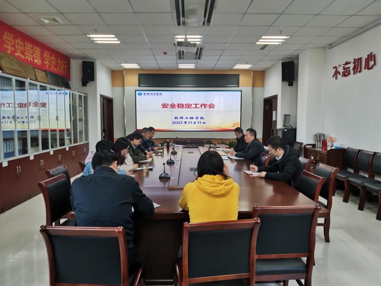 11月11日下午,软件工程学院在科技楼2-325会议室召开安全稳定工作会,学院党委书记徐志国、副书记徐斌、副院长胡勇及各系、中心、科室主任参加了会议。会议由徐志国主持。