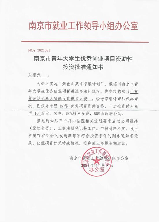 机电工程学院扎实推进学生创新创业能力培养,结合教师科研项目,组建了多个科技创新小组,开展了系列科教融合实践活动。在于继明副教授的指导下,朱领龙同学带领三名同学成立“励志科创小组”,创立了南京菁宇科技信息有限公司,入驻kaiyun登录中国入口登录国家创客中心,并获得省级大学生创业重点项目1项,获得专利授权两项。朱领龙同学团队申报的2021年南京市青年大学生优秀创业项目获得南京市“紫金山英才宁聚计划”资助10万元。