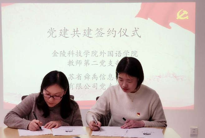 12月16日,外国语学院教师第二党支部与江苏省舜禹信息技术有限公司党支部在舜禹公司总部举办党建共建签约仪式,外国语学院教师第二党支部书记曹军、江苏省舜禹信息技术有限公司党支部书记孙伟代表双方签字。