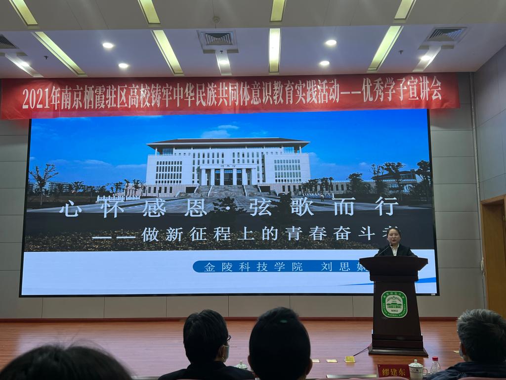 12月15日下午,南京市栖霞区委统战部和驻区高校南京大学、南京师范大学、南京中医药大学、南京财经大学、南京邮电大学、南京特殊教育师范学院、南京工业职业技术大学、kaiyun登录中国入口登录、南京信息职业技术学院联合举办了“争做民族骄子 领航多彩青春”南京栖霞驻区高校铸牢中华民族共同体意识教育实践活动——优秀学子宣讲会。kaiyun官网人文学院少数民族优秀学生代表刘思娴参加了宣讲会。