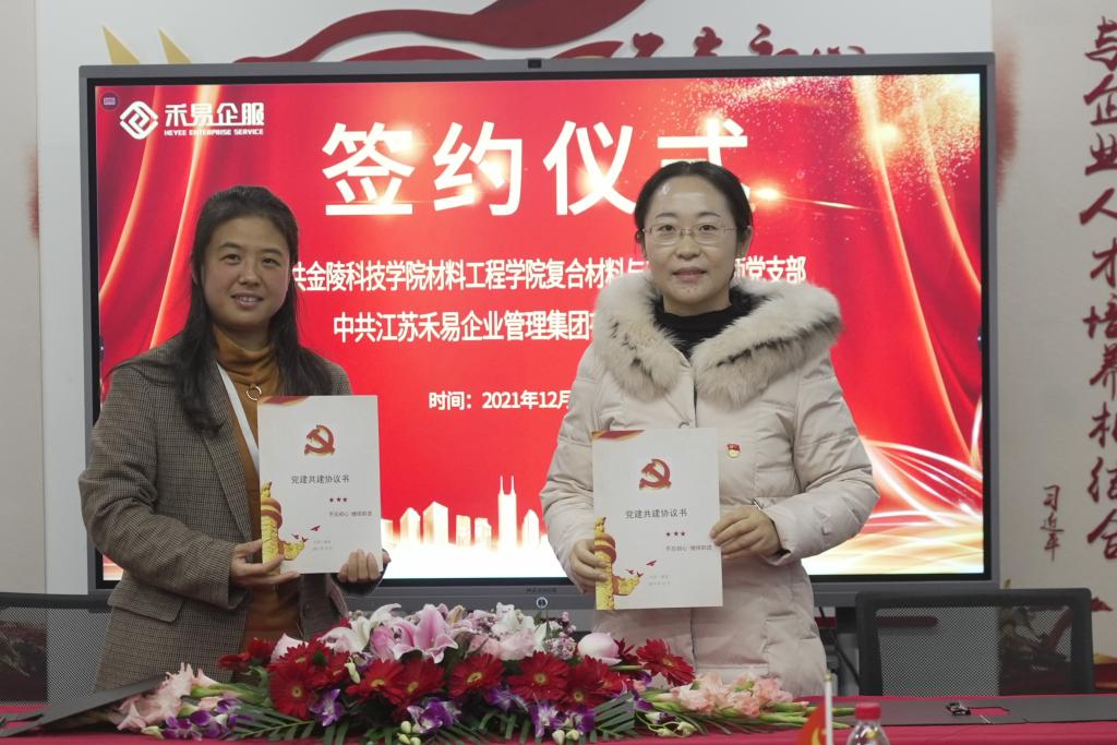 复合材料系教师党支部书记王昆彦、江苏禾易企业管理有限公司党支部书记陈蕾代表双方签署共建协议。双方确定了三个共建内容:一是增进互动,提高基层党组织建设质效;二是增强互通,促进双方事业高质量发展;三是优化资源,实现双方互赢新局面。