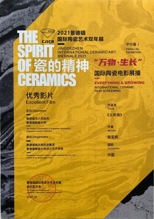金宝良导演、制作的记录电影《义井烧》,在“瓷的精神-2021景德镇国际陶瓷艺术双年展”的平行展“万物•生长国际陶瓷电影展播”活动中入围,经9位国内评审专家评审,获得十部优秀作品之一。