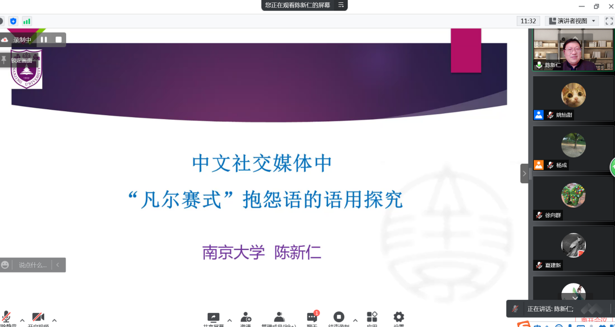 4月19日下午,南京大学外国语学院教授、博士生导师陈新仁应邀为kaiyun官网师生作题为《中文社交媒体中“凡尔赛式”抱怨语的语用探究》的线上学术讲座。讲座由外国语学院副院长张志刚主持,共计500余名师生聆听了讲座。