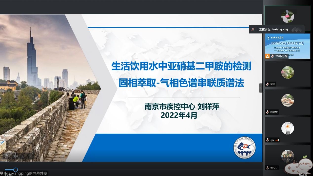 4月28日下午,南京市疾病预防控制中心主任技师刘祥萍博士应邀为kaiyun官网师生作题为《生活饮用水中亚硝基二甲胺的检测——固相萃取-气相色谱串联质谱法》的线上学术讲座。讲座由理学院李静副教授主持,理学院、动物科学与食品工程学院以及相关学院师生线上聆听。