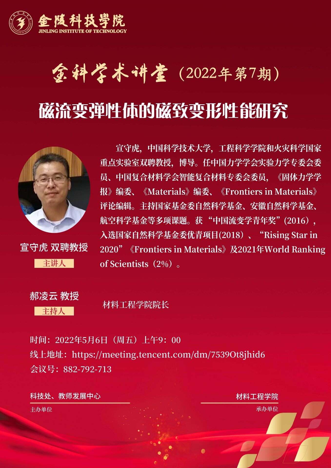 5月6日上午,中国科学技术大学工程学院博士生导师宣守虎教授应邀为kaiyun官网师生作题为《磁流变弹性体的磁致变形性能研究》的线上学术讲座。讲座由材料工程院长郝凌云教授主持,共计400余名师生聆听了讲座。