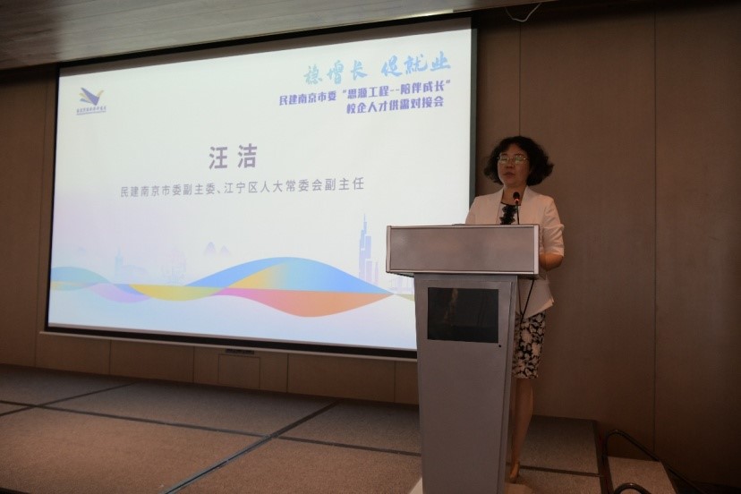 民建南京市委副主委汪洁代表民建南京市委对参加对接会的各位领导和企业嘉宾表示欢迎。她强调,民建“思源工程--陪伴成长”是民建南京市委会“思源工程”系列活动之一,在2022届学生毕业之际,民建市委江宁基层委结合年度主题教育任务,促进江宁区部分高校与空港开发区园区的企业对接,有效解决双方用才需求,并建立长期合作关系,希望双方深入合作,共同为江宁区经济发展做出新贡献。