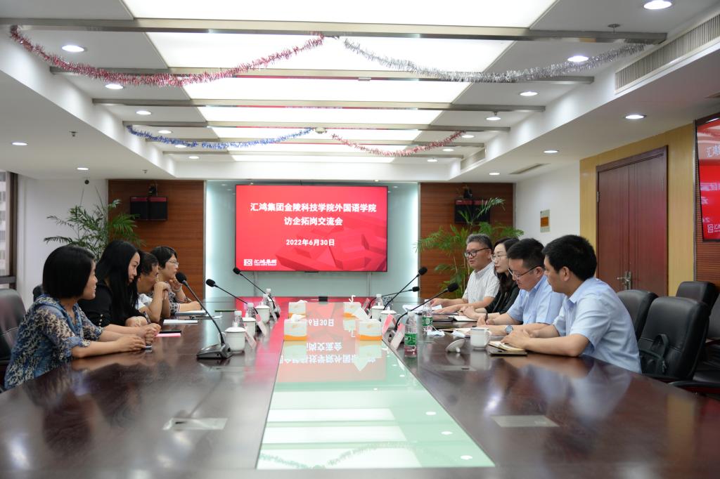 6月30日上午,外国语学院党总支部书记李星、副院长张志刚、副院长李凤及教学管理科科长晏文梅一行赴汇鸿集团开展“访企拓岗促就业”专项活动暨校外实习基地签约洽谈活动。汇鸿集团党委委员、副总裁毕金标,汇鸿中天公司党委书记、董事长朱浩,汇鸿集团运营管理部总经理、汇鸿医药公司党委书记、董事长包振兴,汇鸿集团党委组织部部长、人力资源部总经理陈红等热情接待了李星一行。