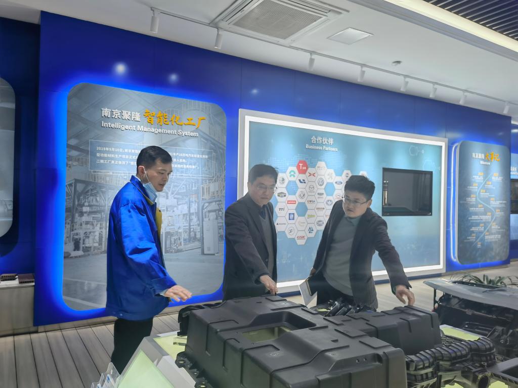 南京聚隆科技股份有限公司总裁陆体超、副总经理王明军、人力资源总监李云热情接待了材料学院一行,介绍了公司的发展历程、主要荣誉,并带领参观了公司世界级的数字智能化工厂,展示了复材分公司研发的尖端产品。