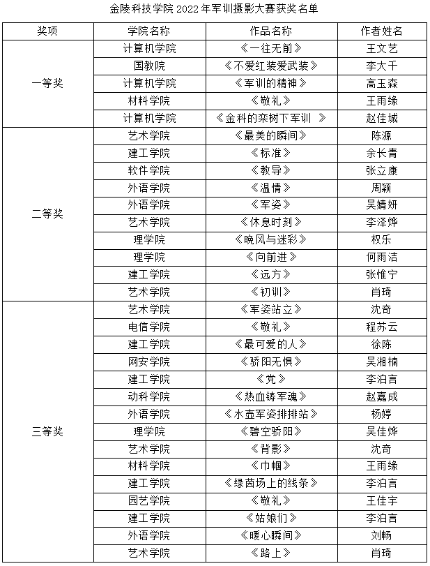 10月中旬,学生工作处开展的2022年度军训摄影大赛活动顺利结束。本次活动以“青春献礼二十大、同心筑梦固国防”为主题,以摄影的形式引导学生爱党、爱国、爱军、爱校,培养学生的奋勇争先,昂扬向上的优秀品质。经评审,选出一等奖5名、二等奖10名、三等奖15名,获奖名单如下: