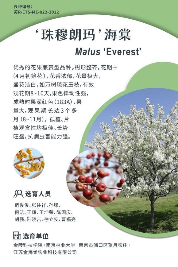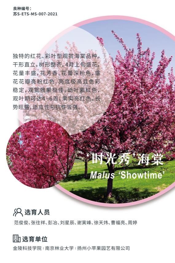 园艺园林学院两个海棠省级林木良种(‘时光秀’和‘珠穆朗玛’海棠)参展了本届海棠花节新优品种展。‘时光秀’海棠(Malus ‘Showtime’)于2021年通过了江苏省林木品种审定,该品种为优秀的红花、彩叶型观赏海棠品种;干形直立,树形整齐;4月上旬盛花,花量丰盛,花芳香;花蕾深粉色,盛花花瓣亮粉红色,亮度极高且色彩稳定,观赏效果极佳;幼叶紫红色,观叶期可达4~6周;长势旺盛,适应性与抗性皆强。‘珠穆朗玛’海棠(Malus ‘Everest')于2022年通过了江苏省林木品种认定,该品种为优秀的花果兼赏型品种;树形整齐,4月初始花,花香浓郁,花量极大,盛花洁白,如万树琼花玉枝,有效观花期8~10天;果色律动性强,成熟时果深红色,果量大,观果期长达3个多月;长势旺盛,抗病虫害能力强。