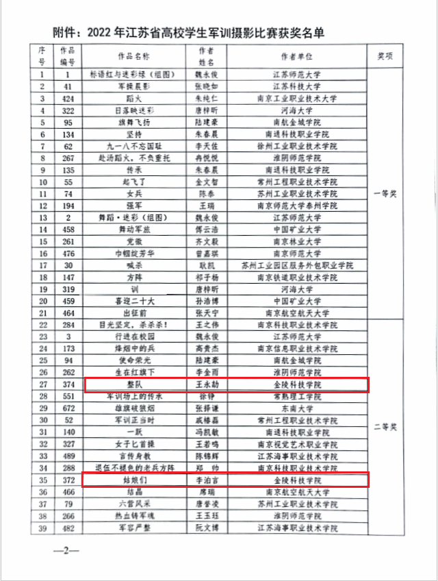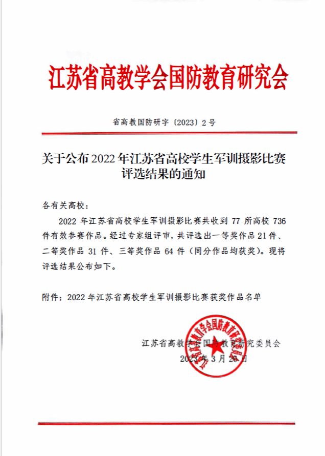 日前,江苏省高教学会国防教育研究会公布了2022年江苏省高校学生军训摄影比赛评选结果,kaiyun官网学生投稿作品分别获得二等奖两项、三等奖一项。