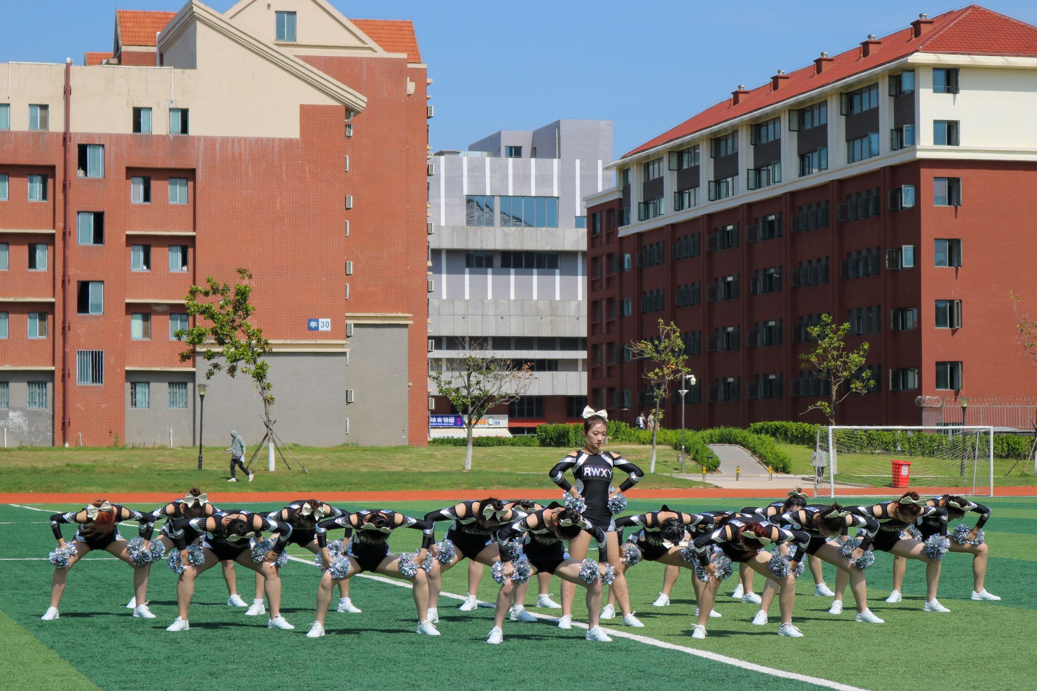 展演中,“青焰人文”啦啦操队队员身着黑色和银色相间的表演服,手捧银色花球,凭借整齐有力的动作和活力四射的舞姿,赢得全场喝彩。炎炎烈日下,队员们以最自信的笑容、最律动的表现将整个现场推向高潮,展现了金科人文学子昂扬向上、奋进拼搏、青春活力的精神风貌。