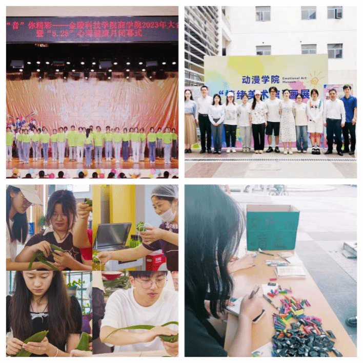 商学院的“心有所向,‘音’你精彩”将心理健康教育与文体活动融合在一起,丰富美育教育内涵,彰显青春朝气;人文学院的“享受春日,放飞纸鸢”引导同学们动起来,感受自然和运动的美好,以明丽灿烂的心情迎接春日的来临;软件学院的“影射人生,唤动心灵”从电影中获得了新的思考和成长,让精神世界开出绚丽的花朵;动漫学院的“情绪美术展”引发同学们对绘画与情绪关系的思考,了解艺术治疗在心理健康当中的作用;园艺学院的“交换心情盲盒活动”引导同学们走出情绪内耗怪圈,认真享受当下的生活;材料学院的“美灵疏心,‘粽’在参与”让同学们在动手实践中减轻了期末考试前的心理压力。各学院从学生实际出发,开展了形式多样、内容丰富的心理健康教育活动,帮助同学们在学习之余放松身心、舒缓压力,为学生赋予“心”能量,营造了充满活力、积极向上的校园文化氛围。