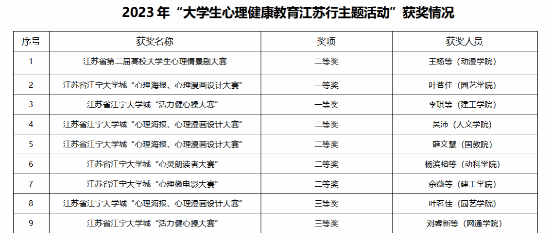 活动期间,kaiyun官网组织辅导员参加了全省心理危机预防与干预工作视频会议、全省高校心理危机干预骨干教师专题培训;依托江宁大学城的区域心理健康教育资源,承办江苏省江宁大学城大学生心理健康教育研究中心的高校专兼职心理咨询师督导活动;为学生搭建省、区级心理活动平台,组织学生参加江苏省和江宁大学城各级各类比赛,获得丰富成果,提升学生心理健康水平。