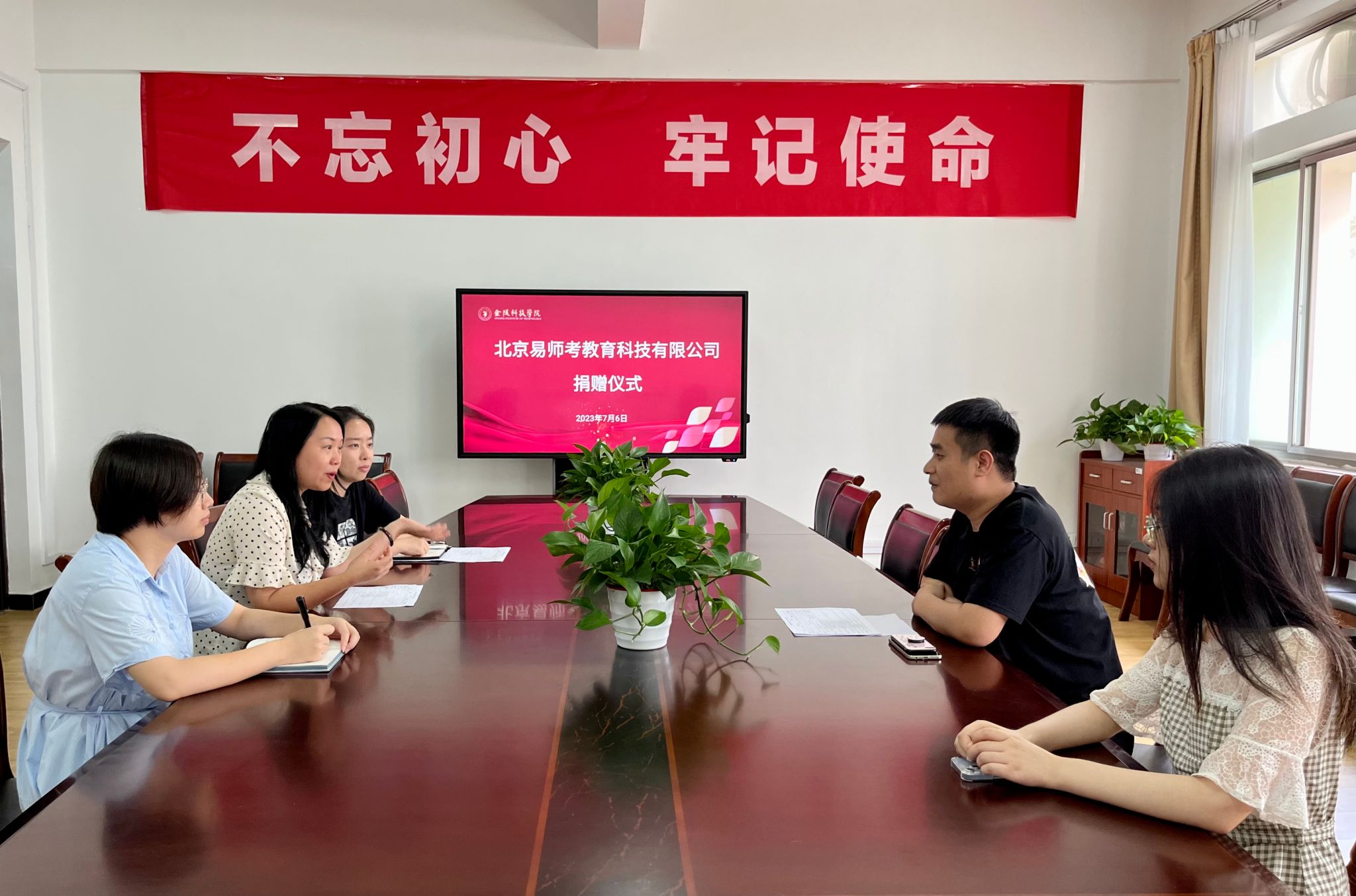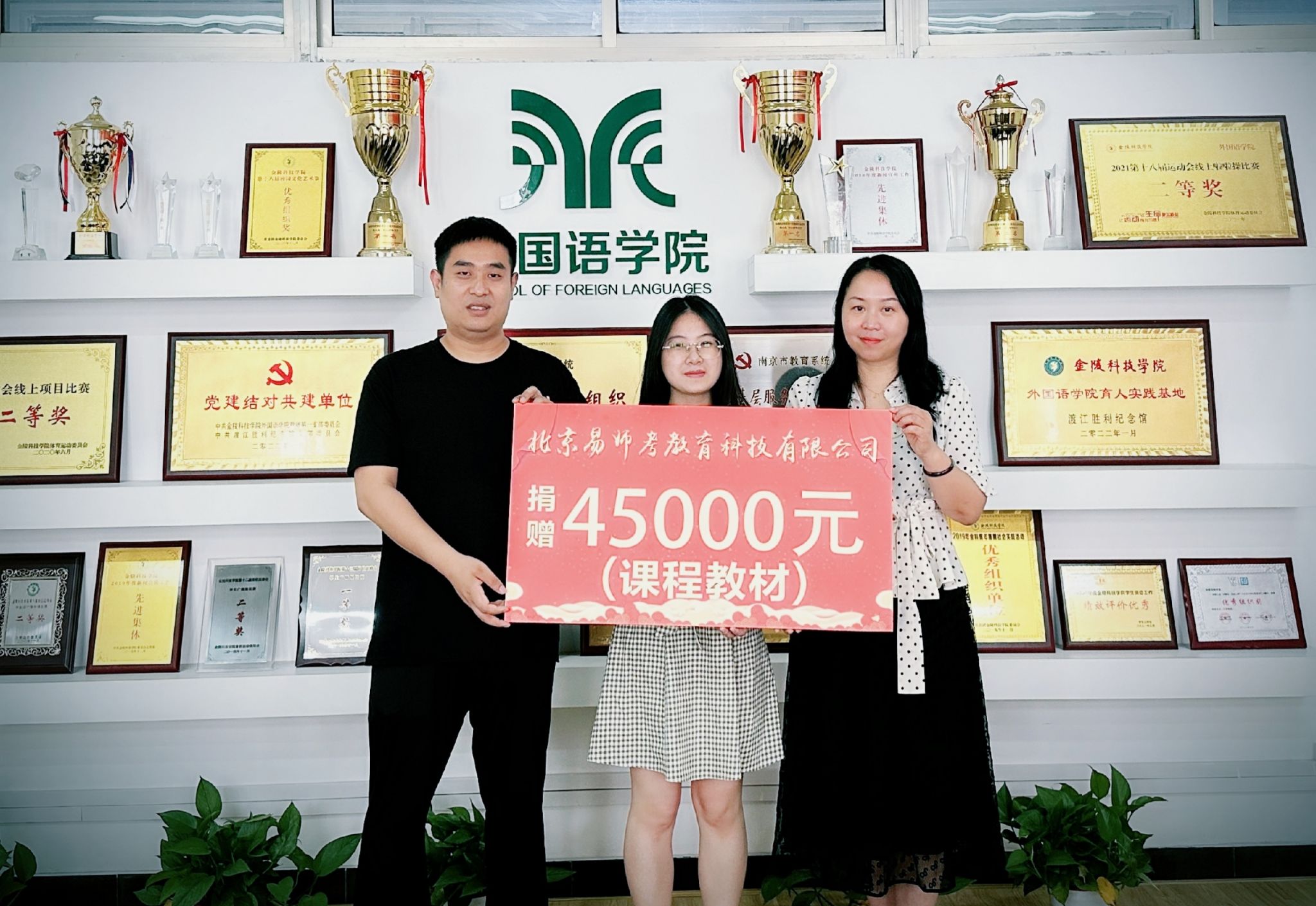 7月6日下午,外国语学院在8210会议室举办校友捐赠仪式,2023届毕业生金梦婷代表北京易师考教育科技有限公司向学院捐赠价值45000元的教材及线上课程。外国语学院党总支部书记李星、学工办主任王奕、综合办副主任姚怡甜出席了仪式。