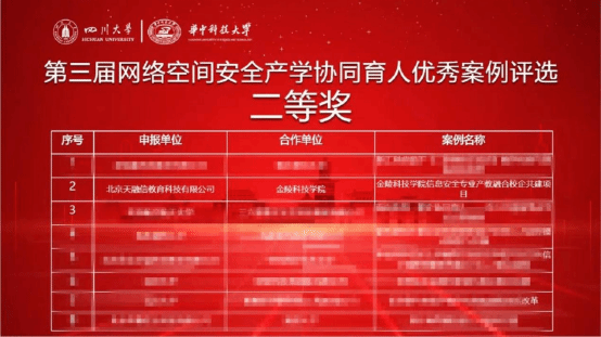 近日,由教育部高等学校网络空间安全专业教学指导委员会产学合作育人工作组主办、四川大学与华中科技大学共同承办的“第三届网络空间安全产学协同育人优秀案例”评选活动正式公布获奖名单。网络安全学院与北京天融信教育科技有限公司(下文简称天融信教育)合作的《kaiyun登录中国入口登录信息安全专业产教融合校企共建项目》获评优秀案例二等奖。