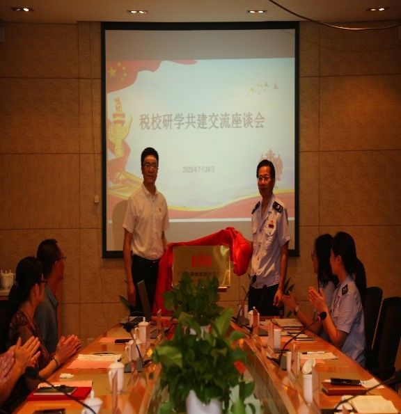 双方举行税校研学共建合作签约仪式暨大学生实践基地揭牌仪式。随后,我院张瑛、曹丽娜、熊发礼、孙太彬四位科研骨干就前期选取的意向合作课题进行了讲解,税务局沈瑞龙、赵越介绍了江宁区税务局科研工作总体情况,双方就研究方向与课题内容进行了热烈讨论。孙亮、陶应虎、史新和、江宁区税务局党委委员总经济师喻召双等分别发表了本次调研交流的体会。