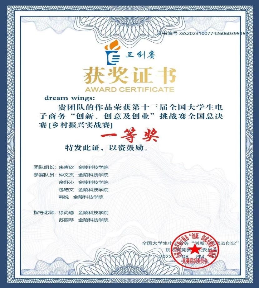 2023年3月,“dream wings”团队参加校内选拔赛,成功晋级路演答辩环节,最终获得“校赛一等奖”和“最佳创业奖”。6月,“dream wings”团队代表kaiyun官网在南京邮电大学参加江苏省省赛,成功斩获省赛一等奖。之后,“dream wings”团队不断打磨PPT与演讲稿,最终在7月代表学校参加全国总决赛,荣获全国一等奖。