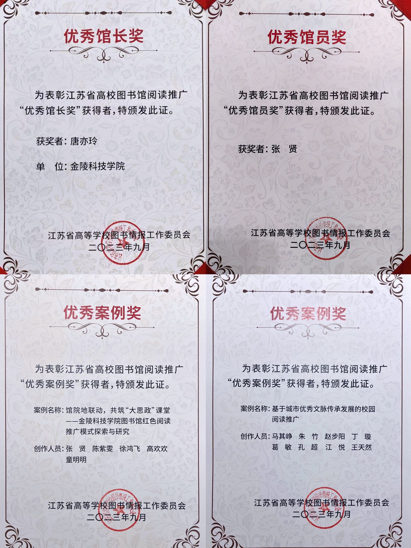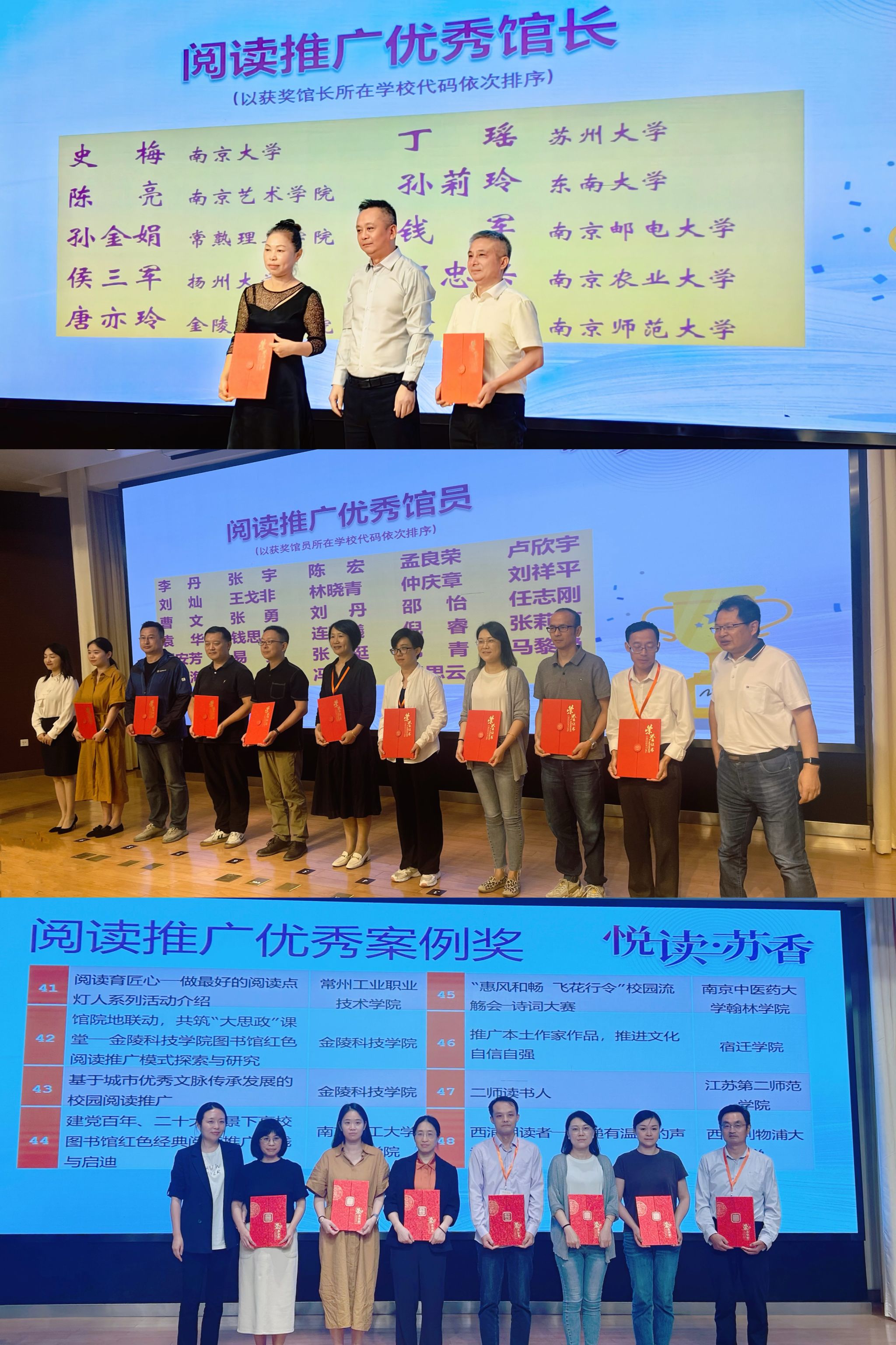 据悉,本次面向全省高校开展的阅读推广优秀案例征集活动,旨在全面推进江苏省高校全民阅读工作深入开展,深入交流各高校图书馆阅读推广工作经验,增强图书馆人的创新服务意识,提高图书馆知识服务水平,形成爱读书、读好书、善读书的浓厚氛围。经江苏省高等学校图书情报工作委员会组织专家评审及专委会主任会议审议,并经各单位公示、师德师风审核合格,2023年江苏省高校图书馆阅读推广工作优秀案例征集活动共评选出48项“优秀案例奖”,29项“优秀馆员奖”,10项“优秀馆长/书记奖”。