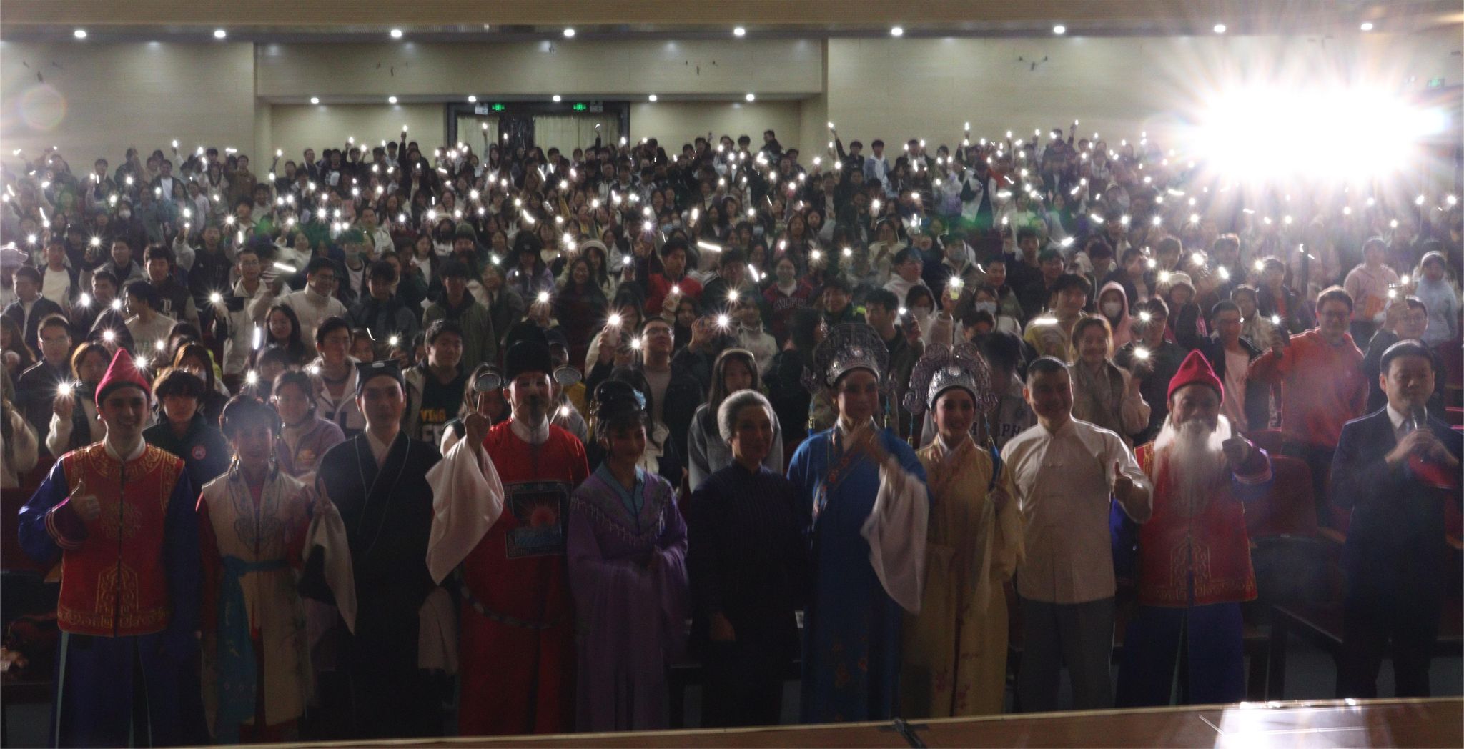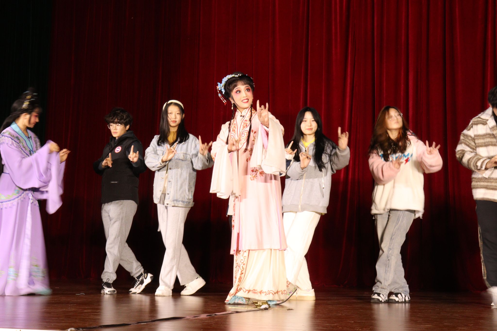 演出正式开始前,主演们带来了妙趣横生的互动环节,多位同学走上舞台跟随主演们学起了戏曲的“手、眼、身、法、步”,一板一眼,有模有样。