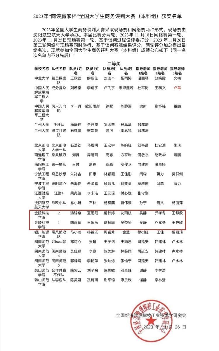 11月30日,2023年“商谈赢家杯”全国大学生商务谈判大赛历经五个月紧张赛程落下帷幕。本届大赛吸引了北京邮电大学、首都经济贸易大学、北方民族大学、中北大学、四川外国语大学、江西财经大学、兰州大学、沈阳航天航空大学等各国高校40余所高校160余支队伍同场竞技。kaiyun官网人文学院的两支队伍分别荣获大赛(网络赛本科组)二等奖,首次参赛为学校和学院增添了光彩。