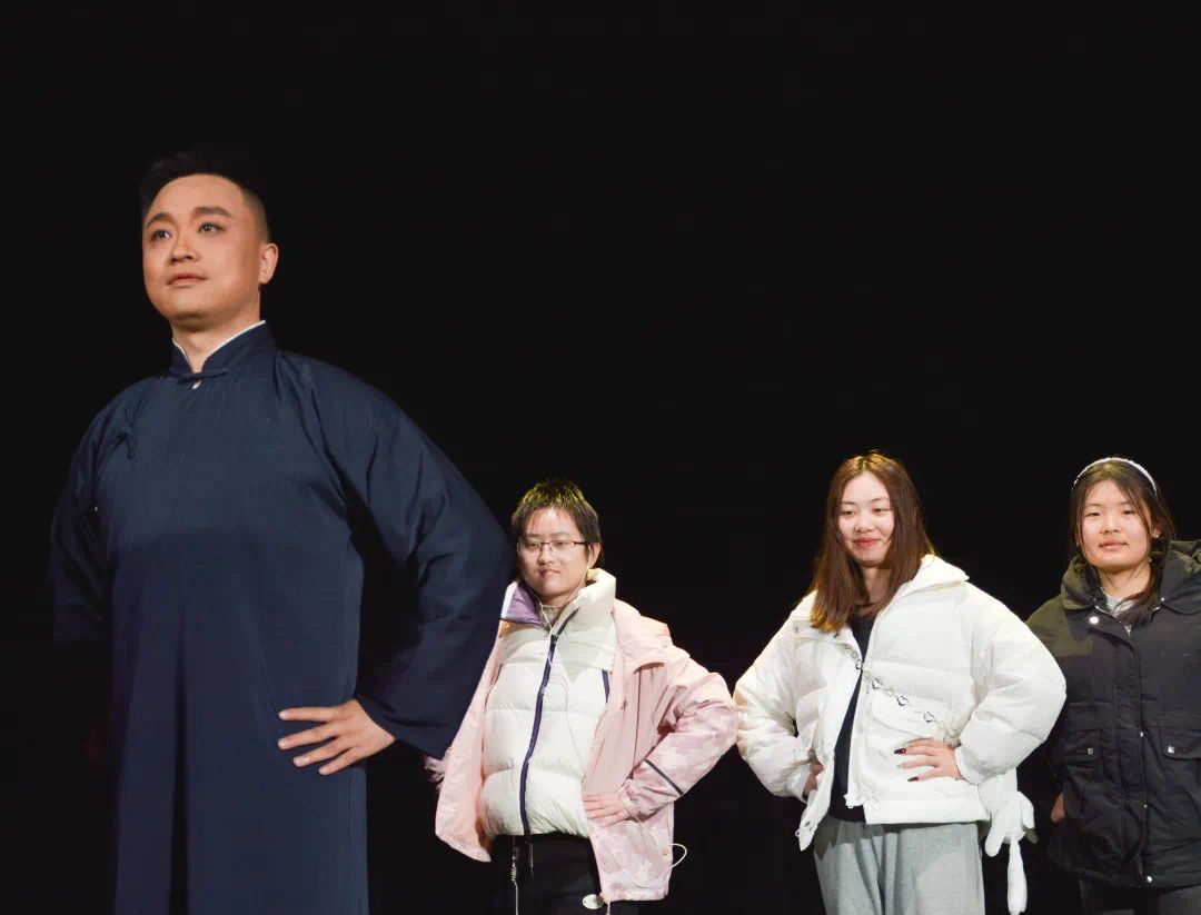 演出开始前,主演们在台上共同探讨了戏曲的传承与发展,并携手主演为同学们带来戏曲身段的入门教学,多位同学走上舞台学起了京剧的“手、眼、身、法、步”,一板一眼,进一步感受京剧的魅力。