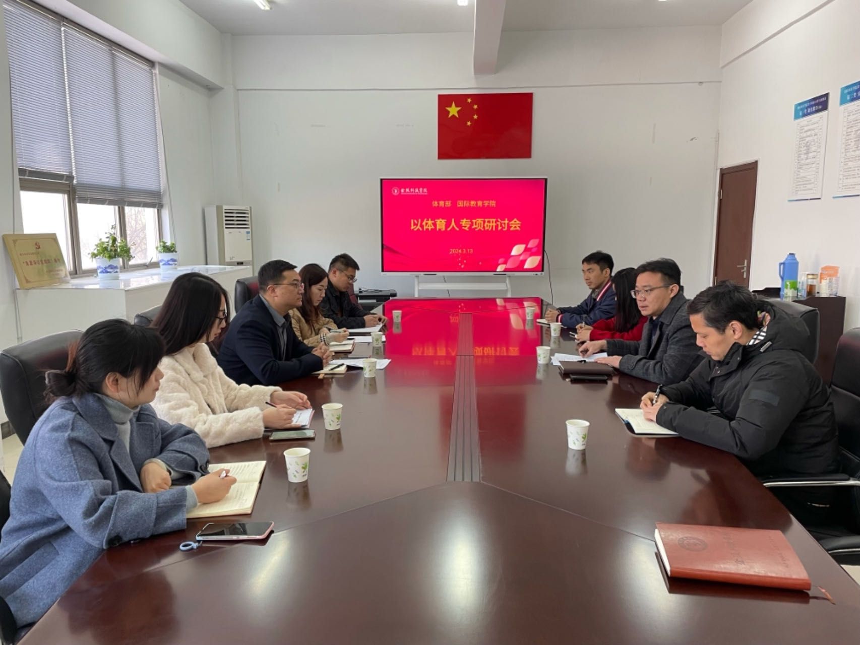 为深入贯彻落实习近平总书记关于教育、体育的重要论述和全国教育大会精神,贯彻落实中共中央、国务院《关于全面加强和改进新时代学校体育工作的意见》及《深化时代改革总体方案》等文件精神,配合学校全面推进“时代新人铸魂工程”实施方案,3月13日,体育部与国际教育学院在体育馆208会议室联合开展了院部协作“以体育人”专项工作研讨会,探索和创新人才培养新路径。