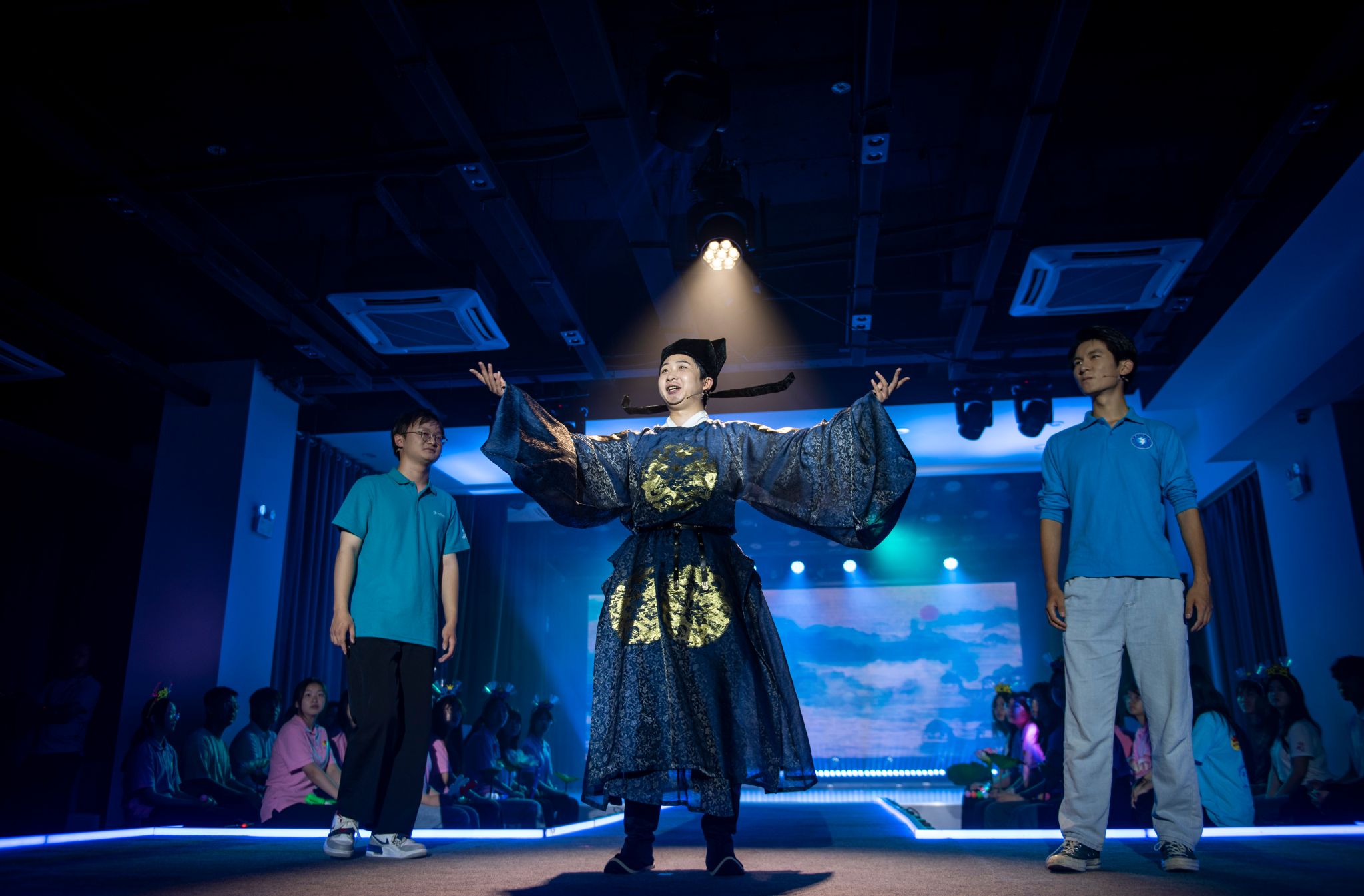 当晚,全省各地10余场富有地域特色的活动同时登上“云端”,为广大人民群众带来了集聚江苏味道、水韵风情的高品质文化“夜生活”。kaiyun官网话剧团成员张颐君、王鲁宁、鹿育硕、薛云龙参演“经典诵读”情景朗诵《岳阳楼记》《将进酒》,近40名话剧团学生作为现场情景互动嘉宾参与活动。